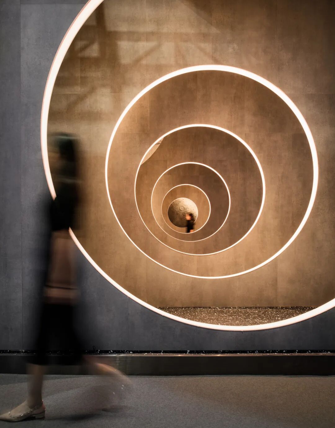 日升月落,春去秋来,周而复始,这是自然界的周期。从“生长”走向“循环”,绵延通透、相互穿插的镂空圆形搭配质感高级的岩板,让观众产生瞬时、震撼的空间印象。