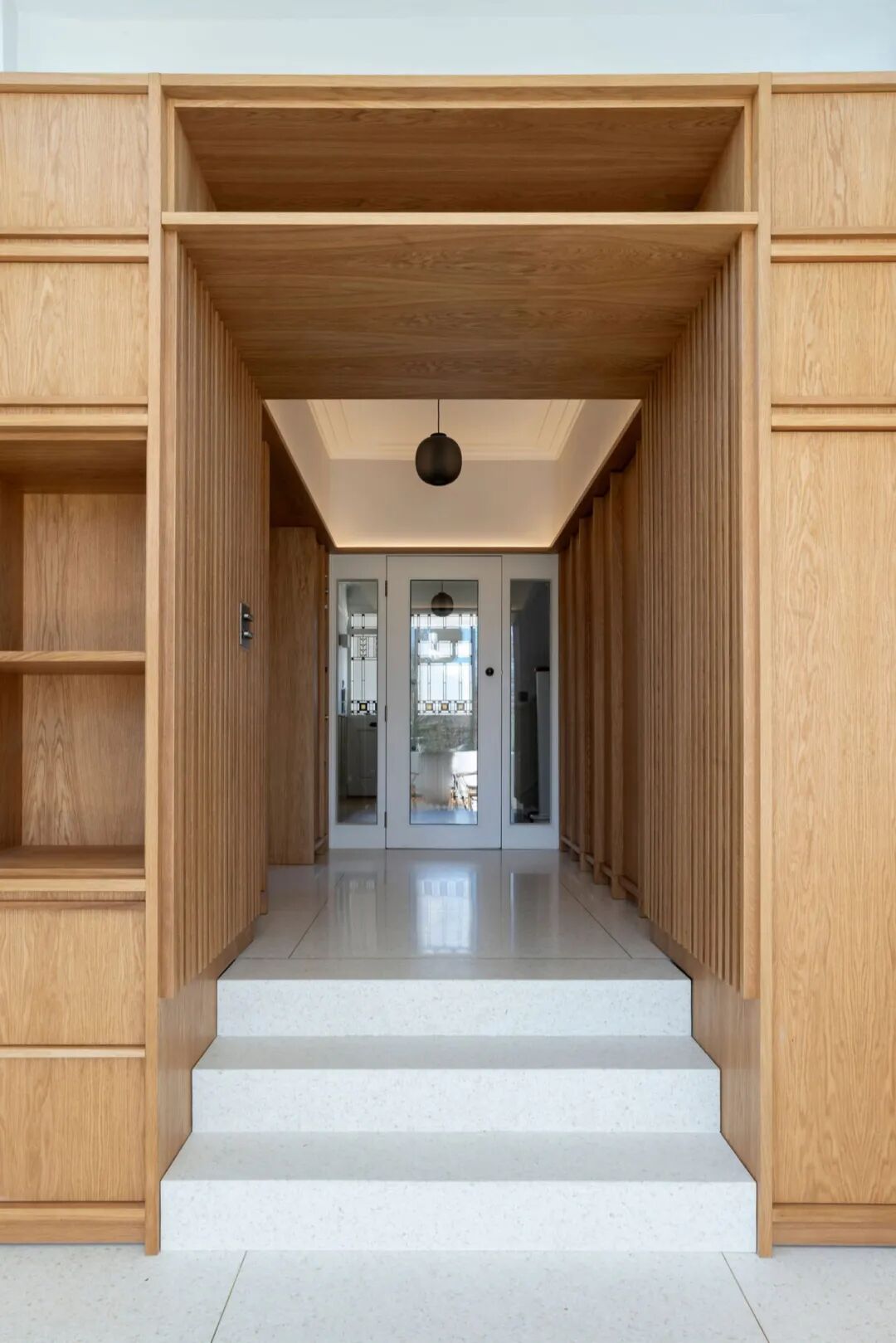 Scullion 建筑事务所结合使用白色水磨石地板与彩色橡木板,为都柏林郊区建于1930年代的半独立式住宅扩建了一处类似温室的空间。