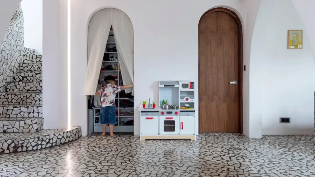 彩色水磨石与明亮的黄色墙壁增强了环境的活力感,再加上水泥地面和白色固定装置,非常适合年轻家庭居住。