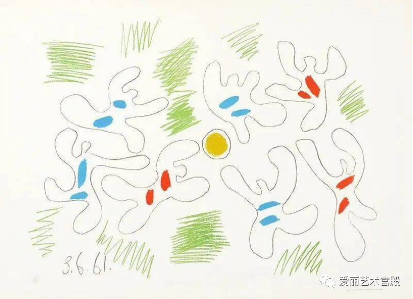 在毕加索的石版画作品《足球》中,红蓝区分的简单人物在草地上手舞足蹈,争抢着画面中央的黄色足球。毕加索用最为概括的凝练形象描绘了争球的场面,只有轮廓的球员充满活力,简单的画面仿佛使人找回童年的快乐和喜悦。