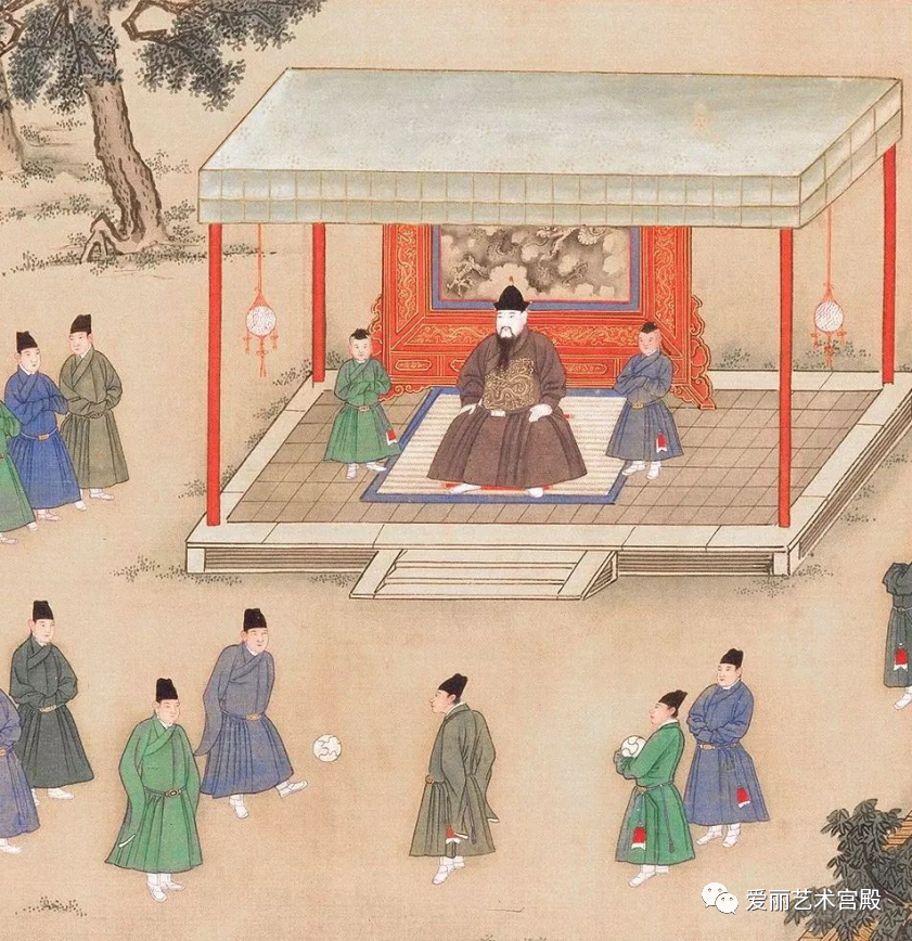明代的《宣宗行乐图卷》亦有一部分表现了当时皇帝热衷蹴鞠的景象,和《宋太祖蹴鞠图》不同的是,这幅图卷中宣宗不再亲自参与蹴鞠,而是端坐台上,观看台下蹴鞠艺人表演。古往今来能有一人包场看足球这种待遇的,恐怕也只有当时的皇帝了吧。