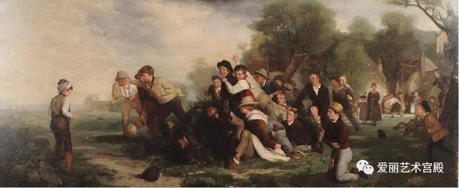 现代足球起源于12世纪的英国,而足球比赛是当时英国忏悔礼拜二的传统保留节目。在维多利亚时期著名画家托马斯·韦伯斯特(1800-1886)的笔下,他形象地描绘了一场英国乡村足球赛上,一群男孩逼近守门员的紧张场面。