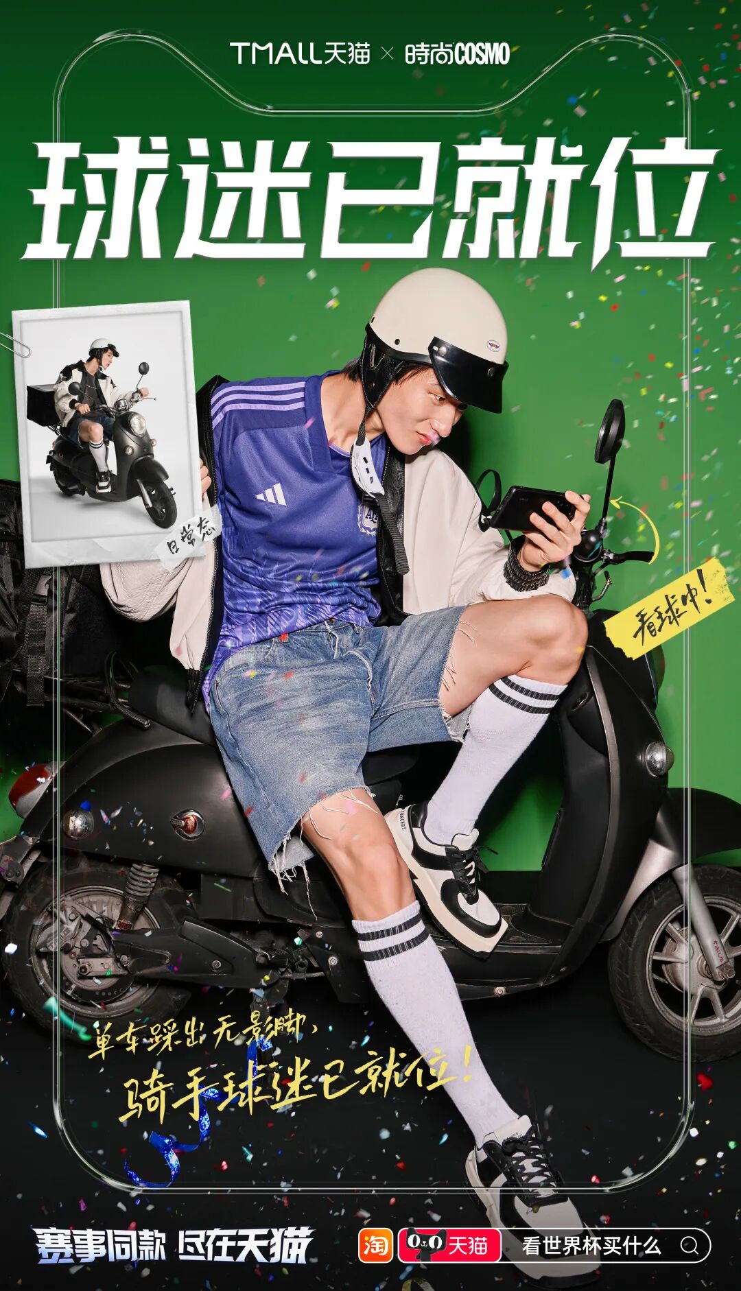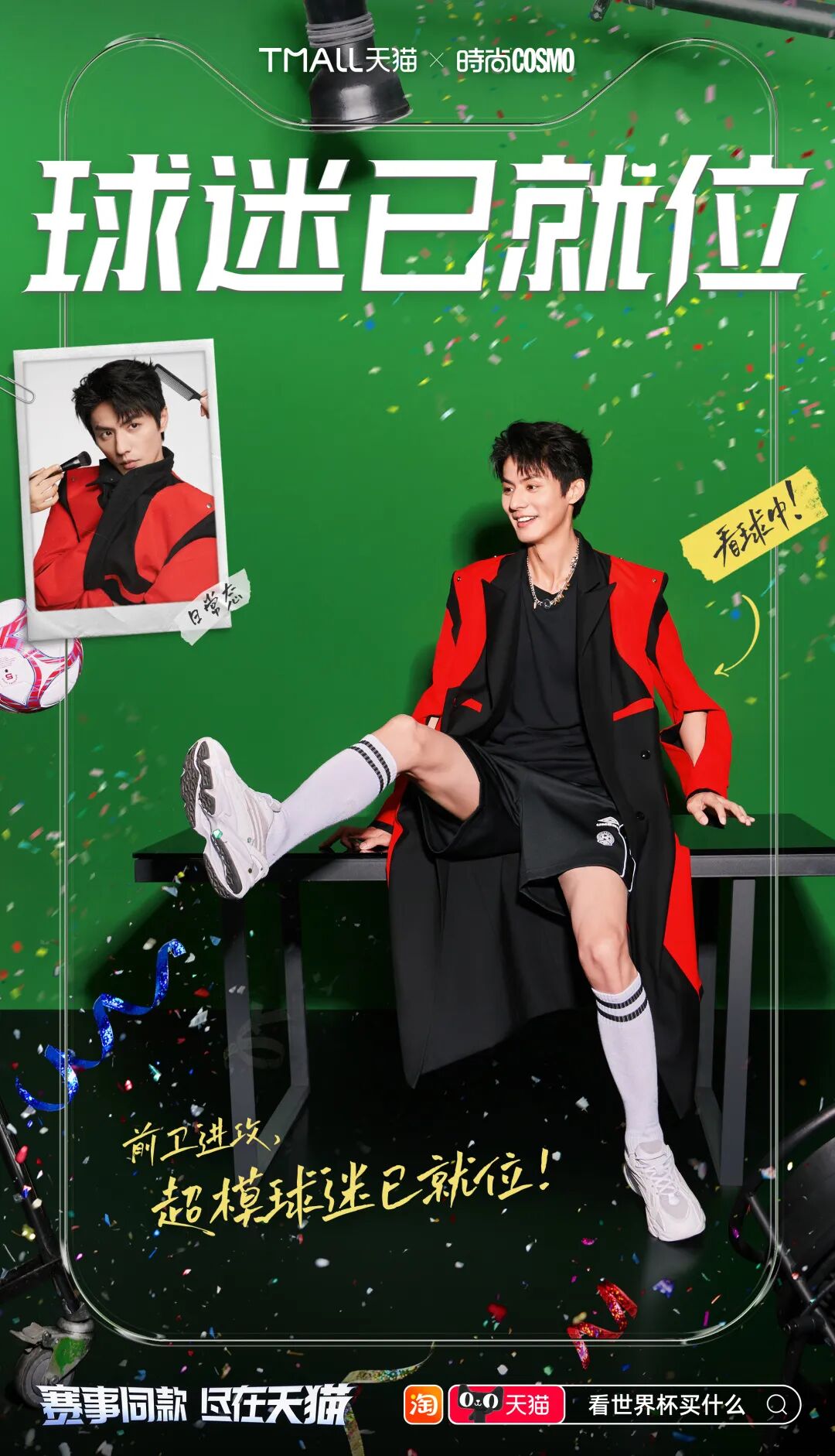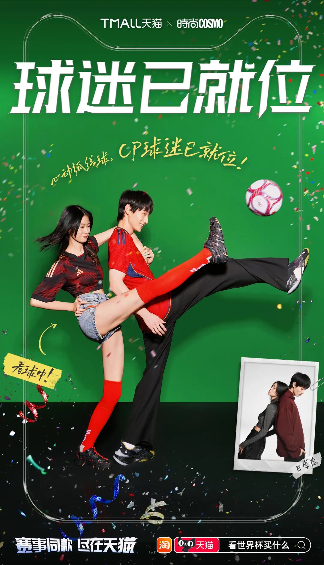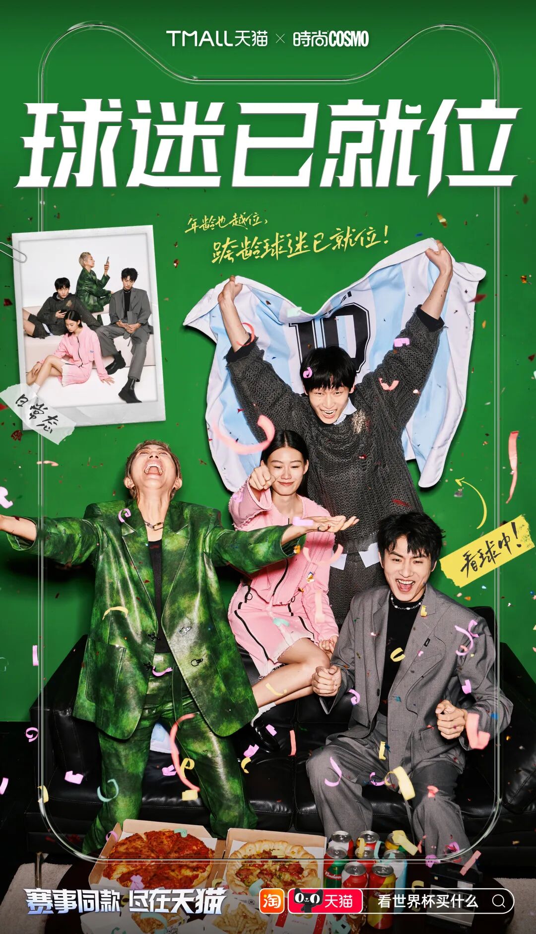天猫推出了官方的球迷「造型」穿搭趋势的官方指引。联动时尚COSMO,发布时尚大片「球迷已就位」,以球迷属性穿搭为主题拍出大片质感的海报,引领世界杯穿搭趋势。