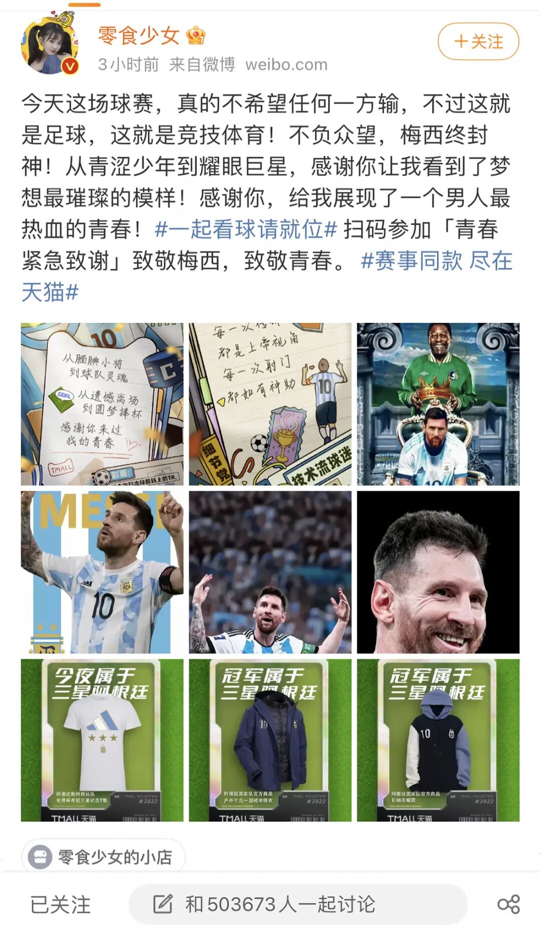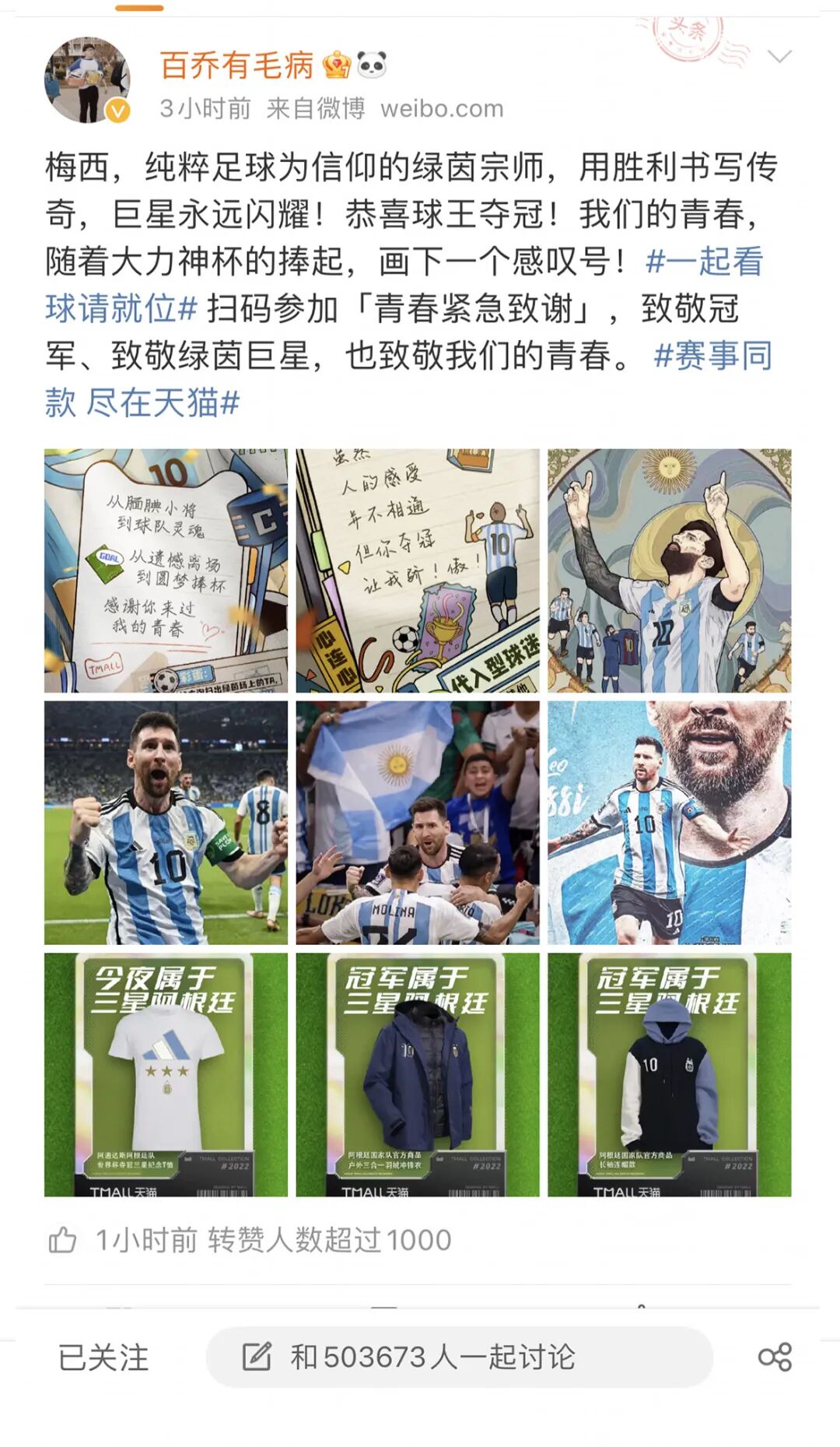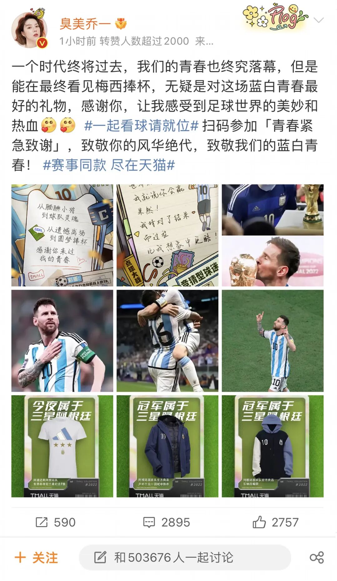 真诚永远是必杀技。「用C罗同款球衣,向青春紧急致谢」的号召主张,「三星阿根廷冠军纪念TEE全网限量抢先购」的趁热打铁,都以深层情感,强化天猫赛事同款的平台心智。