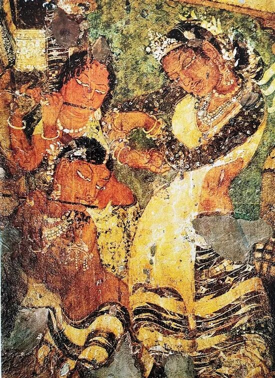 阿旃陀石窟中的壁画,是在岩石表面抹的灰泥上重彩绘画的。石窟深入山体内部,黝黑不见光,画匠如何照明?如何能在黑暗中绘画填色?当是一项绝技。
