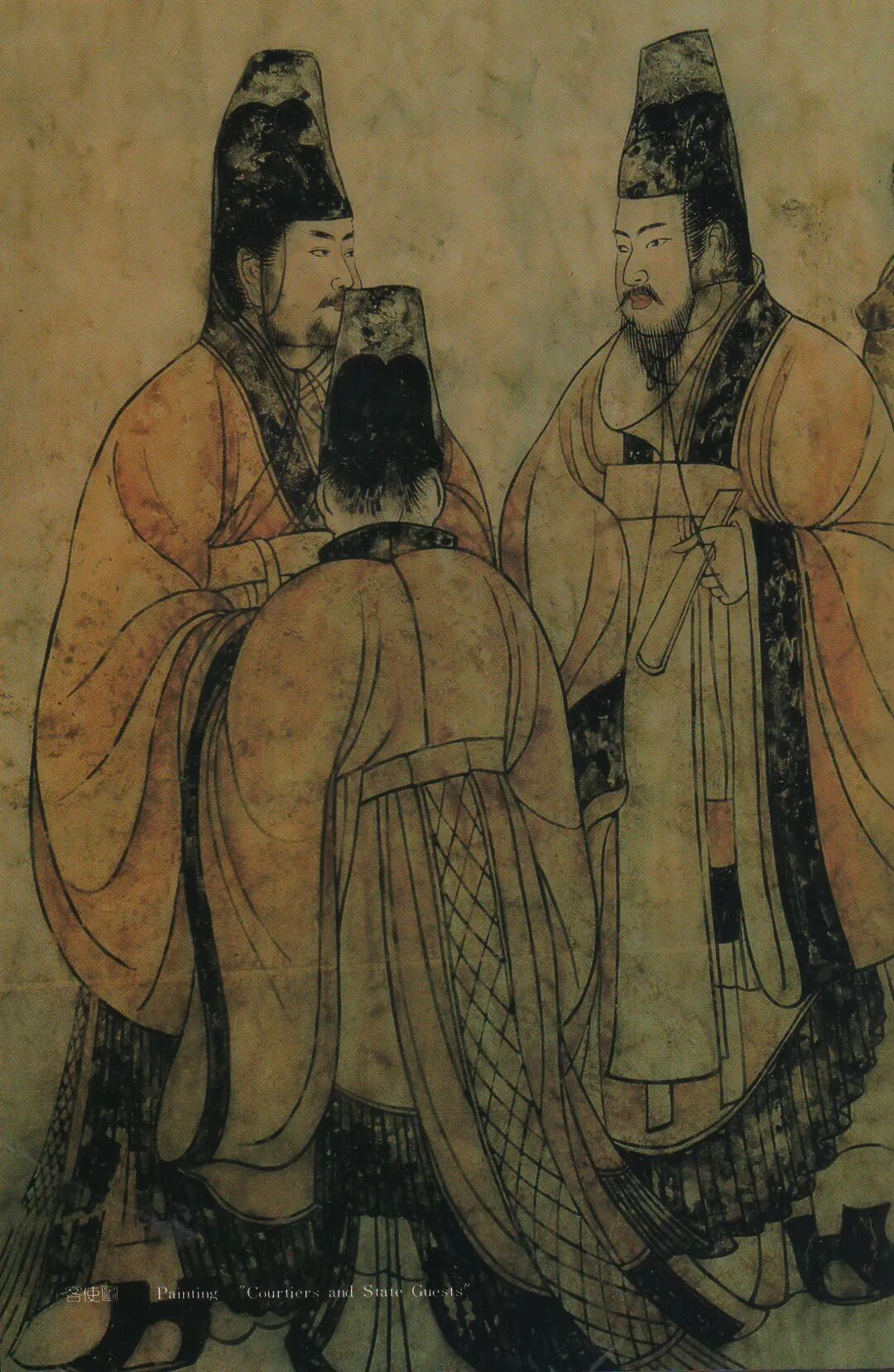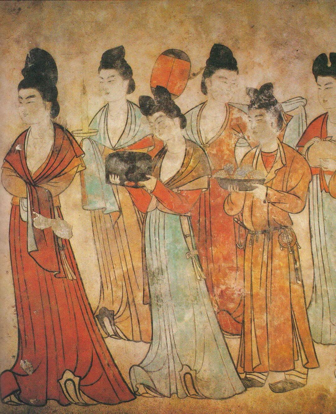 唐代盛世,墓葬极多,里面多有壁画。最精彩的当推乾陵永泰公主墓、章怀太子和懿德太子墓里的壁画。由于他们的地位显赫,身份高贵,在墓室两侧全绘满了壁画,青龙、白虎、仪仗、戟架、护卫、侍从等,宫女一个个丰肌玉面,执器恭立,雍容华贵,各具风姿。虽是墓室的壁画,然而勾勒和填色都认真而工细,俨然有帛画中的宫廷之风,形象与周昉和张萱笔下的唐代妇女相像,异曲同工,再现了初唐之风。