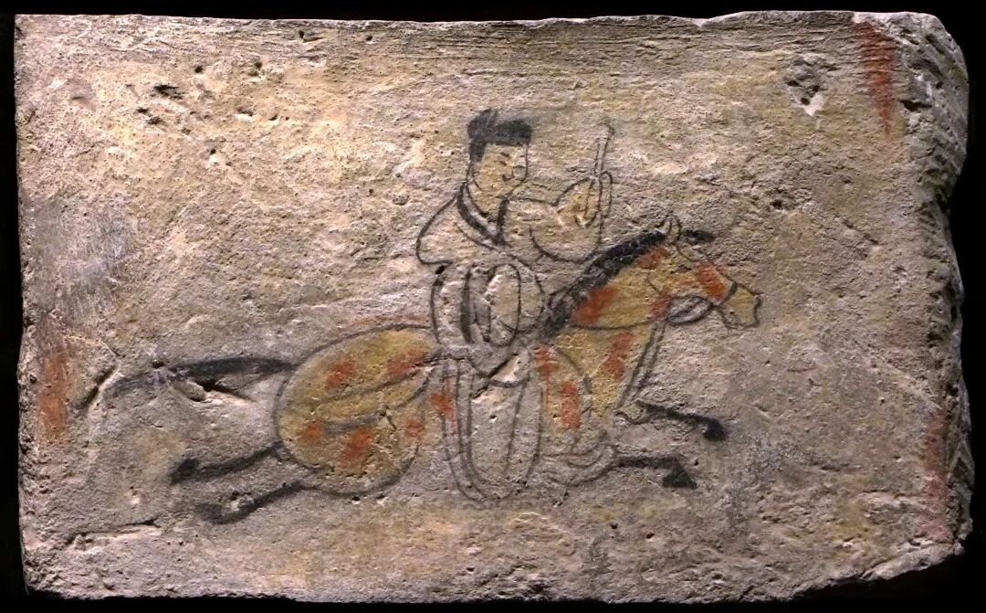 魏晋南北朝时战乱,兴简葬,尽管殉葬的器物不多,但墓室里的壁画却是非常精彩,时有佳构。嘉峪关地区多处的墓葬里出土了7000多块砖画,都是用颜色画在刷白了的砖上的,大多是一砖一画,内容是生活题材,如《射猎》《牵驼》《送饭》《采桑》等,最有名的是一幅《飞骑传邮》,画着一位骑着驿马飞送驿报的人,被选作“中国邮政”的标志。这些砖画都是用墨线勾勒,略略敷彩,用笔简略奔放,与同代的工细壁画有异,而是上承了汉画的写意风。
