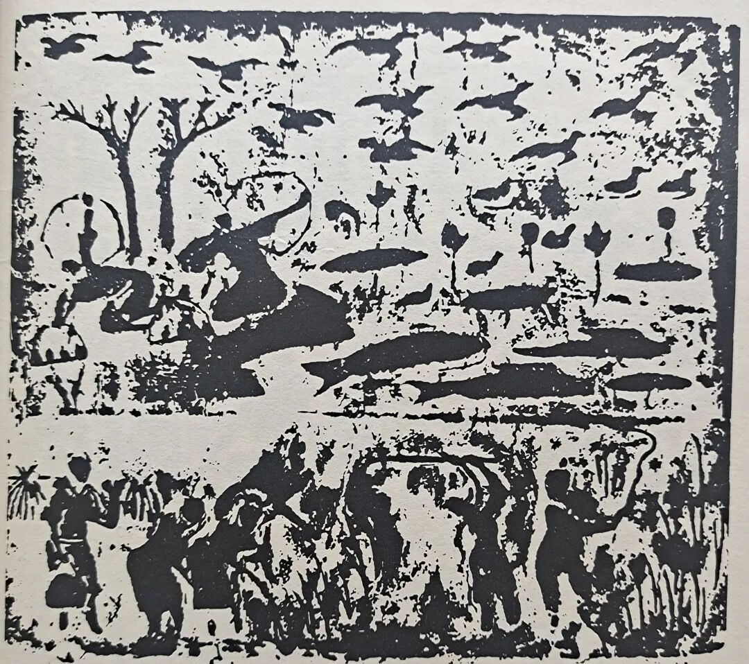 南方由于潮湿,墓室保存不好,彩绘的壁画少见。但丹阳的一座南齐墓中出土了几铺砖印模壁画,其中大有精彩者。《竹林七贤与荣启期》纯用白描手法来勾勒出在历史上极富盛名的“竹林七贤”形象,用不同的动态一一画出他们或放荡不羁、或悠然自得的个性,复活了这些魏晋名士的神态,造型符合南朝“秀骨清像”的标准,繁简疏密得体,是极为难得的杰作。