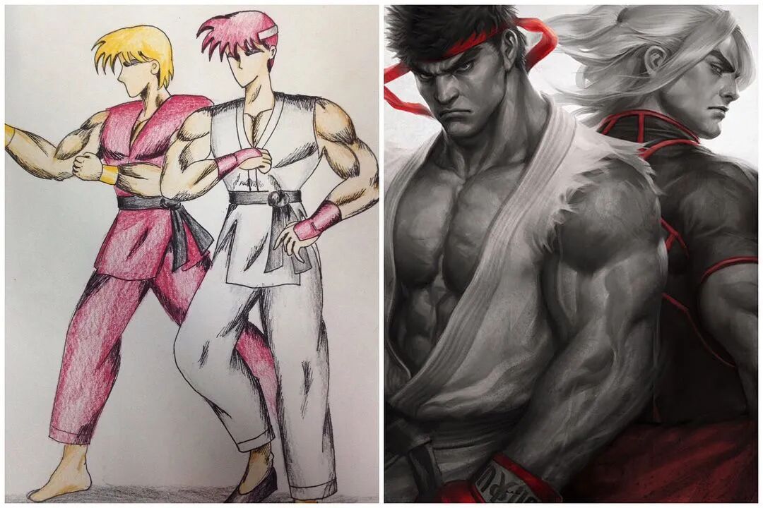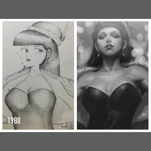左边画风非常稚嫩,略显清奇,结构把控一般。不过却可以看出创作者是在认真刻画细节,有意识增加角色立体感的。
