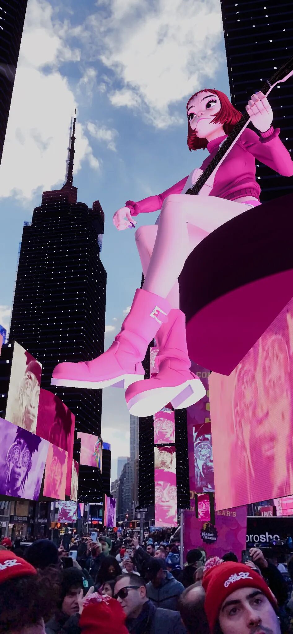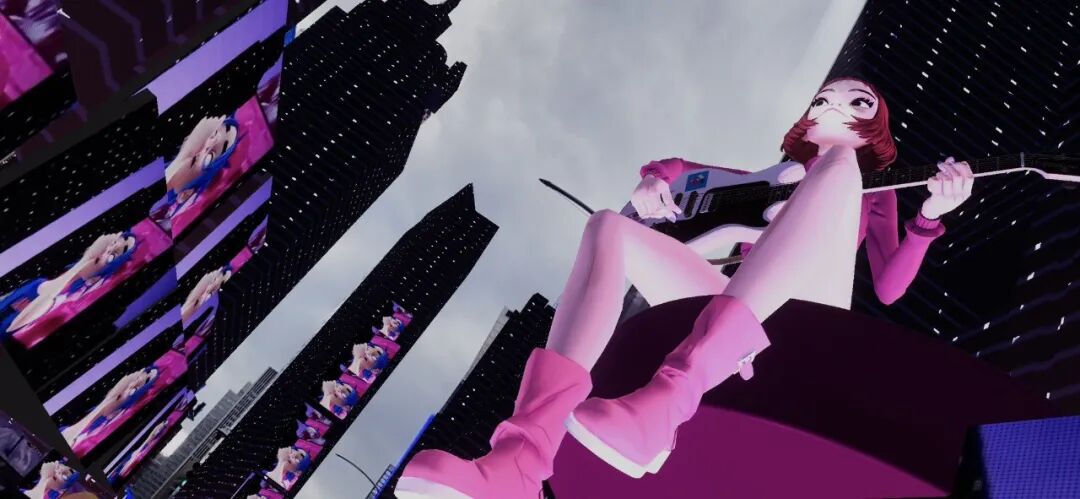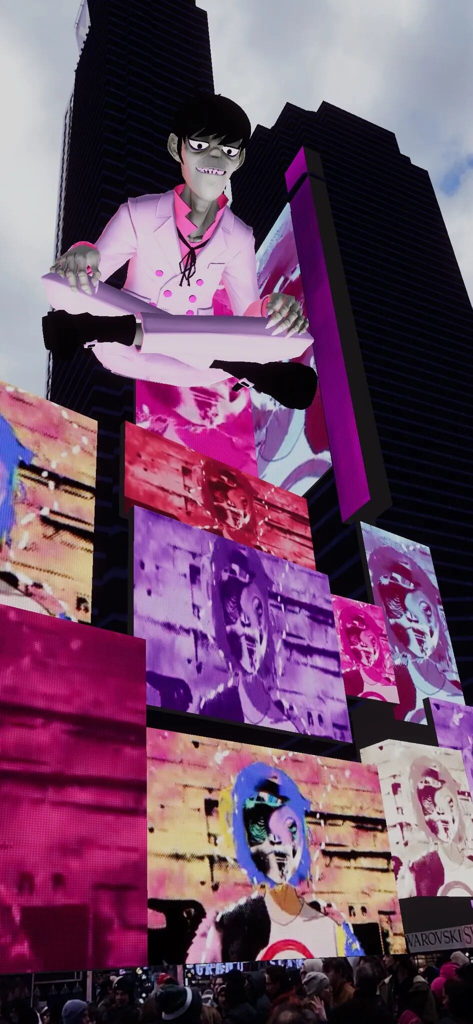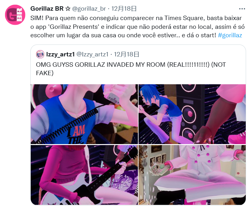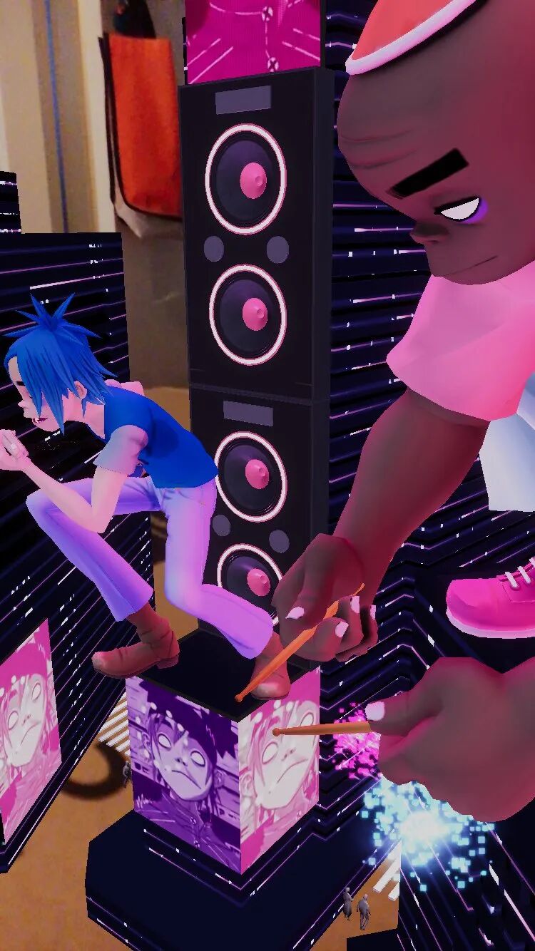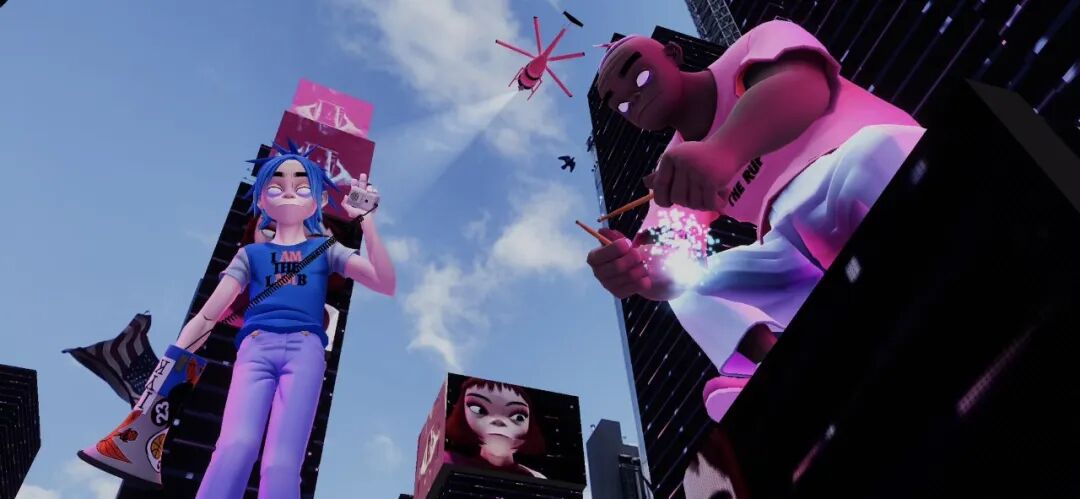 Murdoc、2D、 Noodle和Russel出现在摩天大楼上方,叠加在现实图景之上的AR将整个公共空间变成了虚拟表演会场。