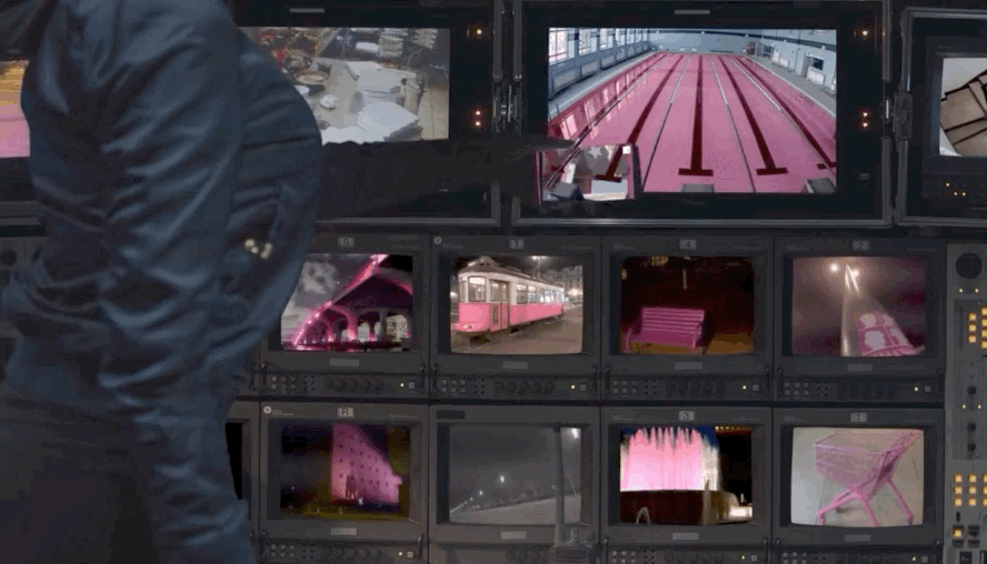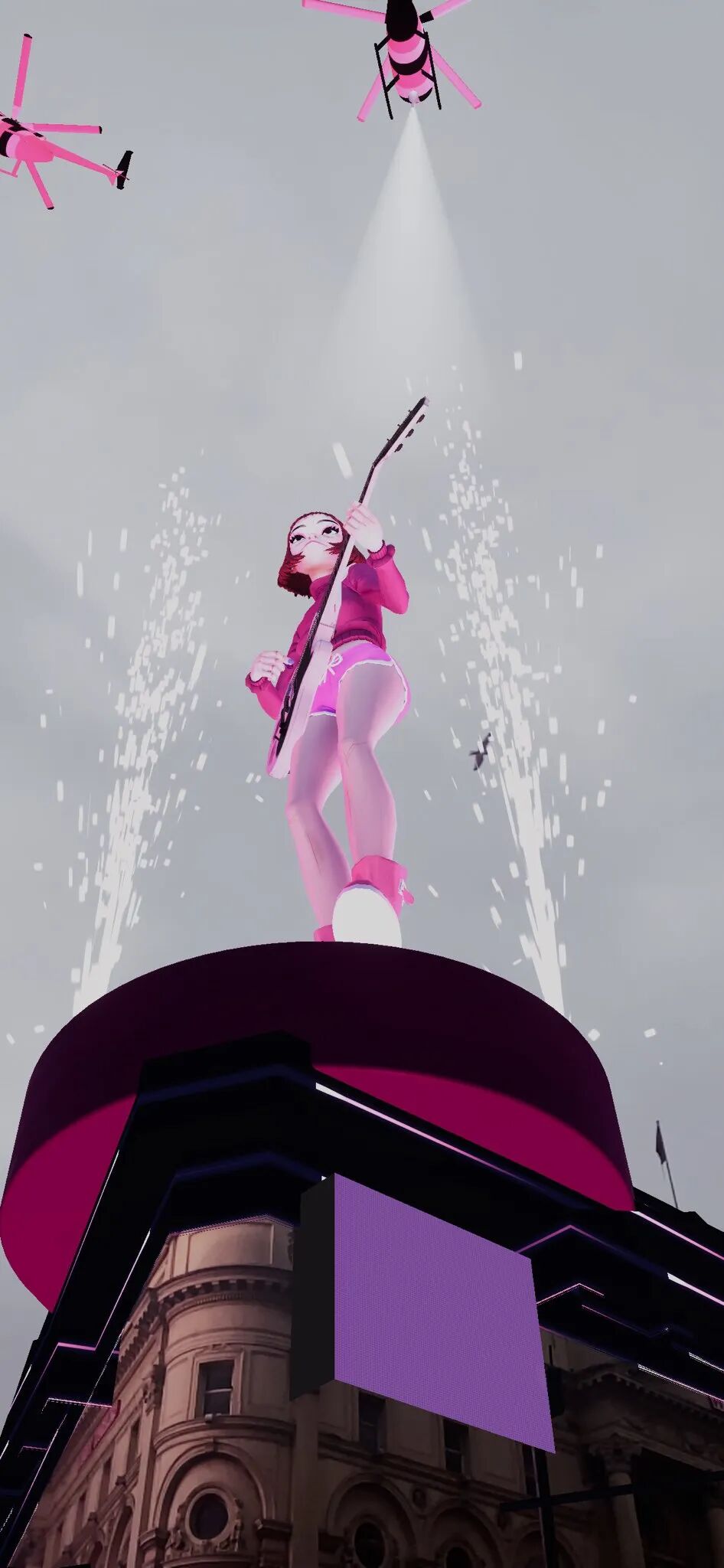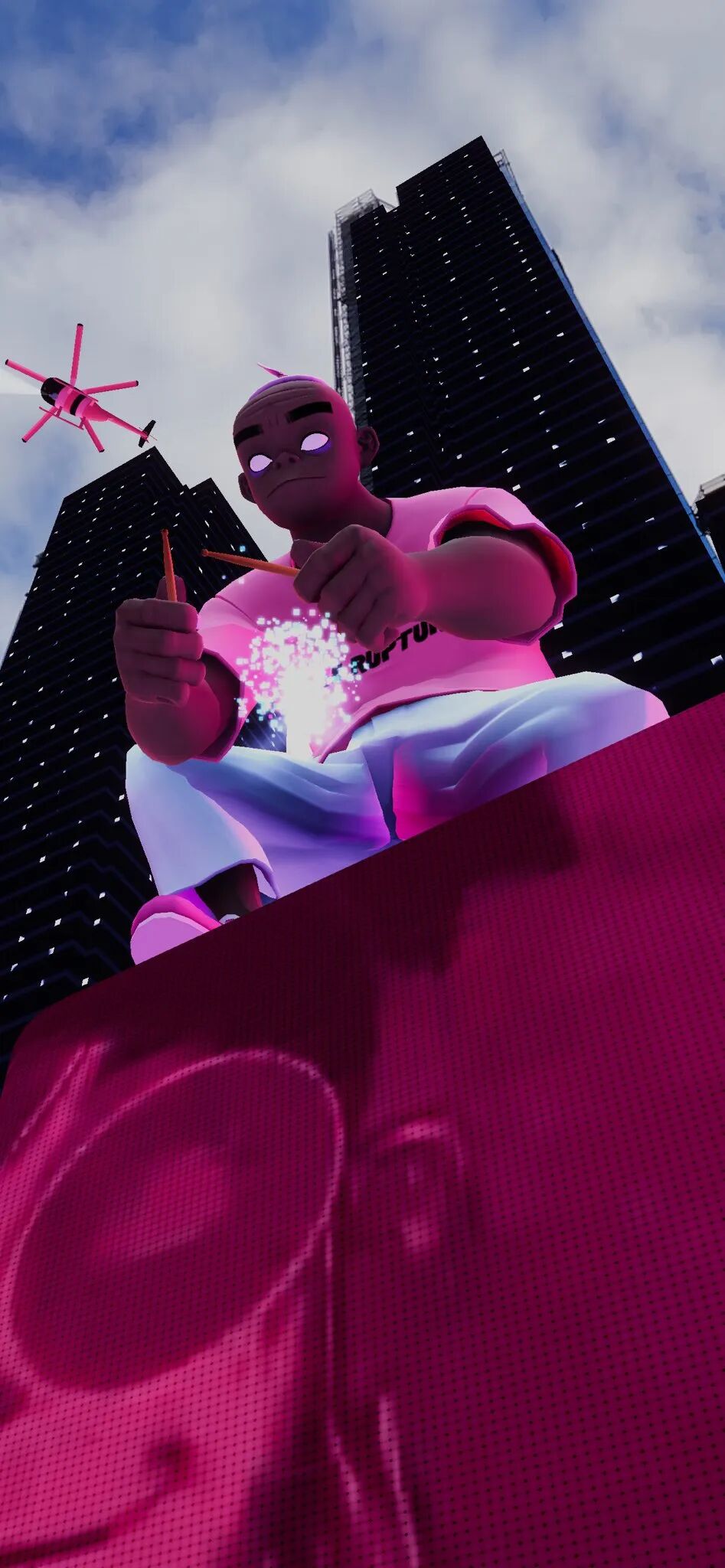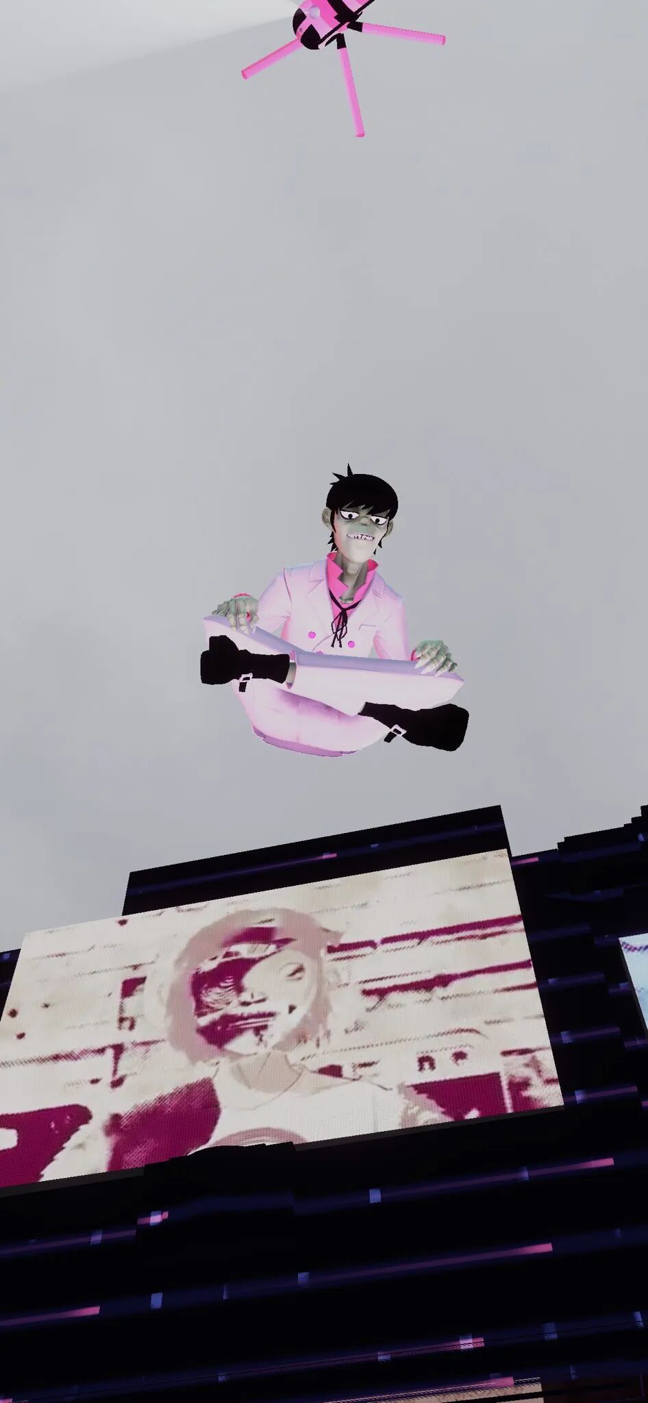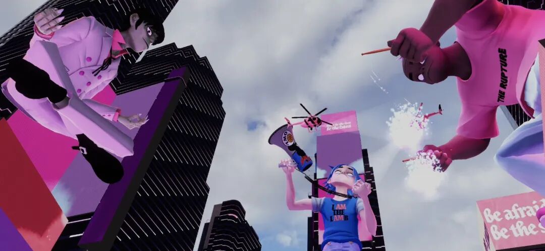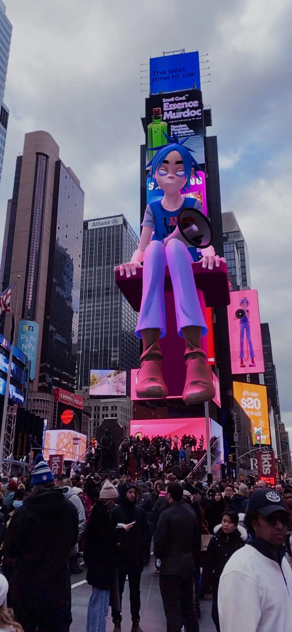 Murdoc、2D、 Noodle和Russel出现在摩天大楼上方,叠加在现实图景之上的AR将整个公共空间变成了虚拟表演会场。
