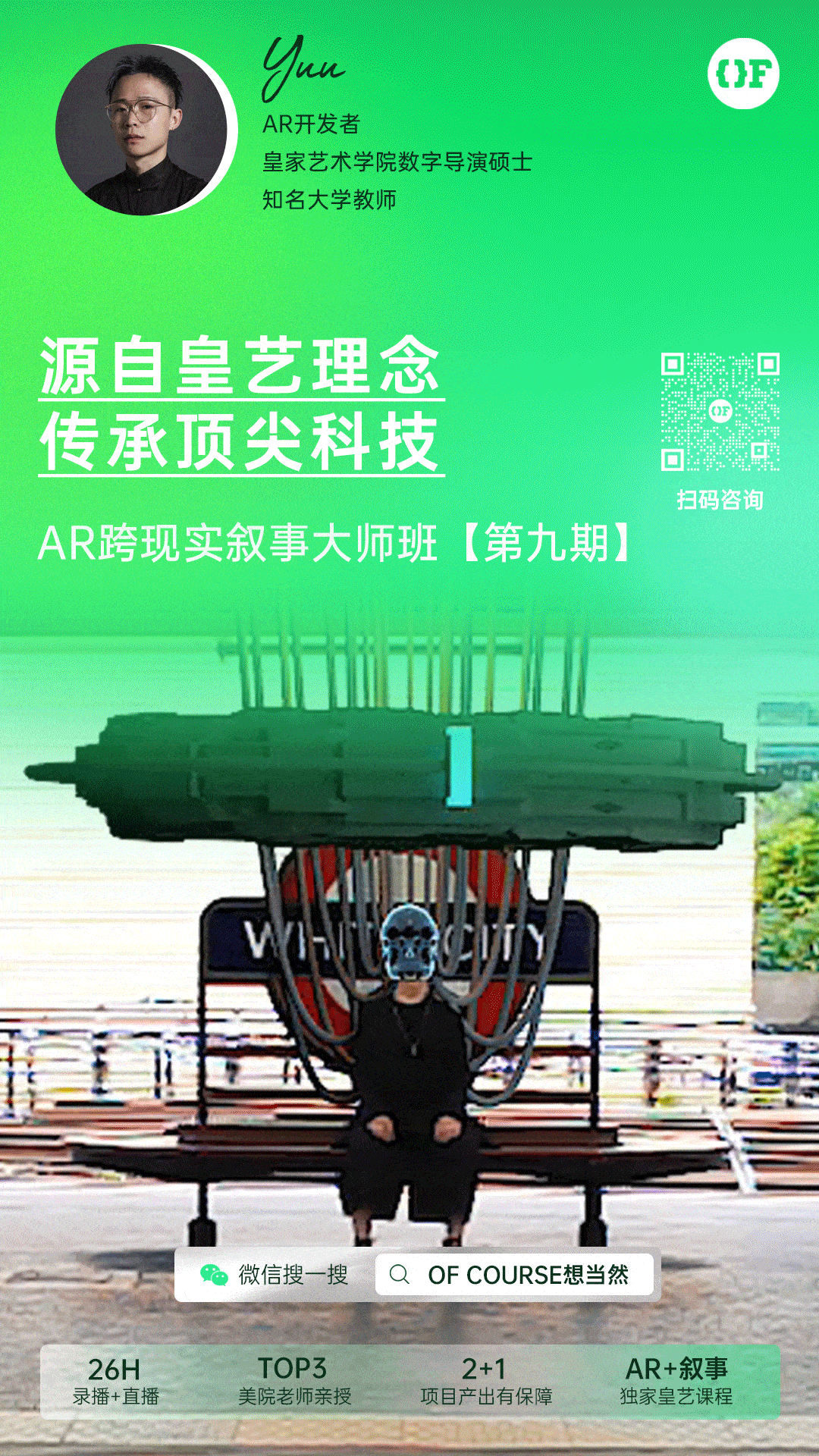 OF COURSE近期也隆重推出了第九期《AR跨现实叙事大师班》。通过学习,你可以零基础学习最强大的实时内容开发平台Unity,迅速掌握AR的真实光影、3D渲染、实时交互等内容。最终,你将完成跨现实叙事艺术作品的产出。