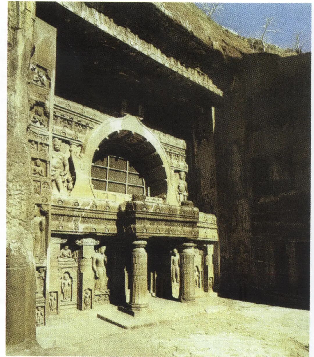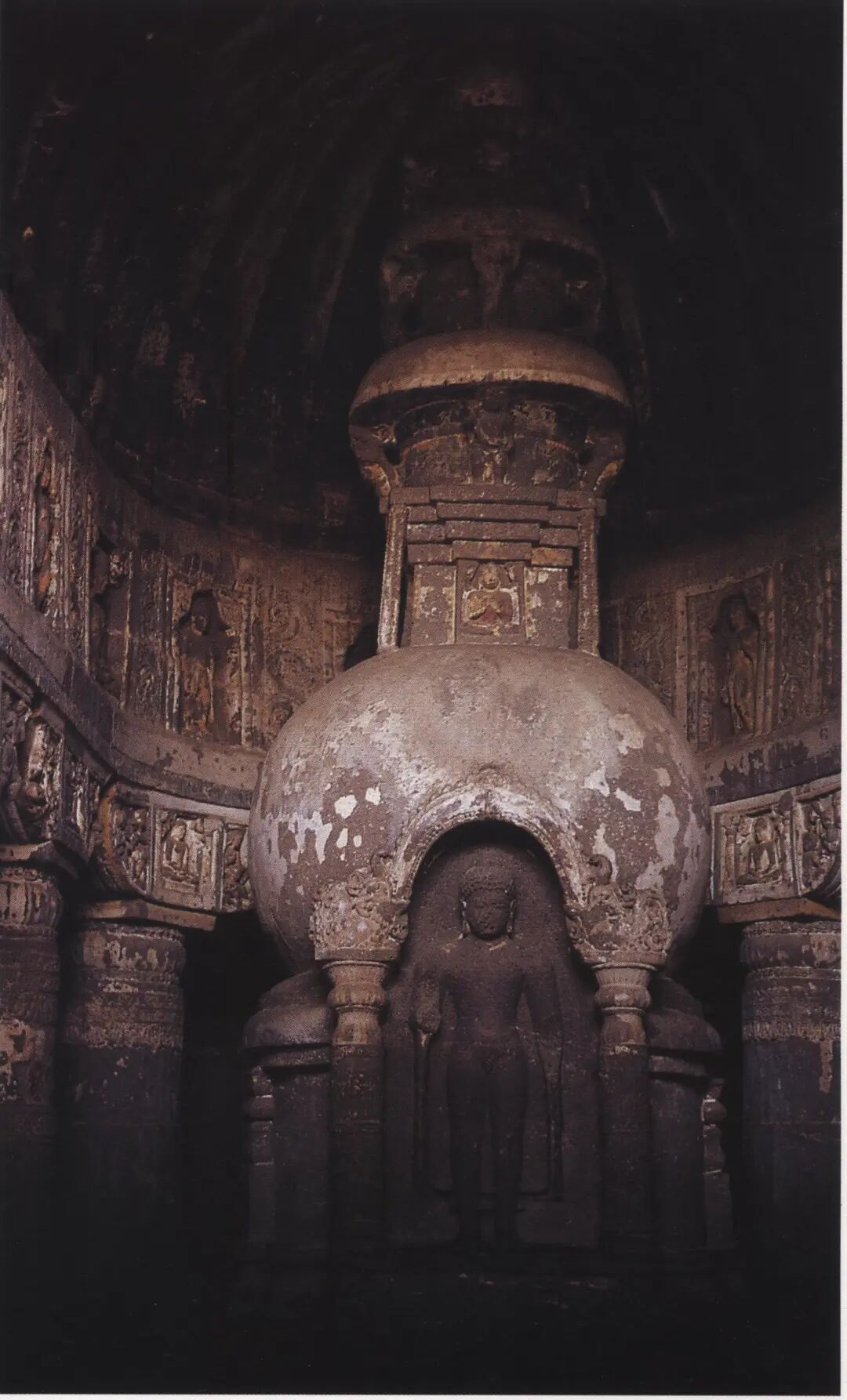 阿旃陀石窟,是从整座山的岩石中凿出来的庙,等于一座负的塔