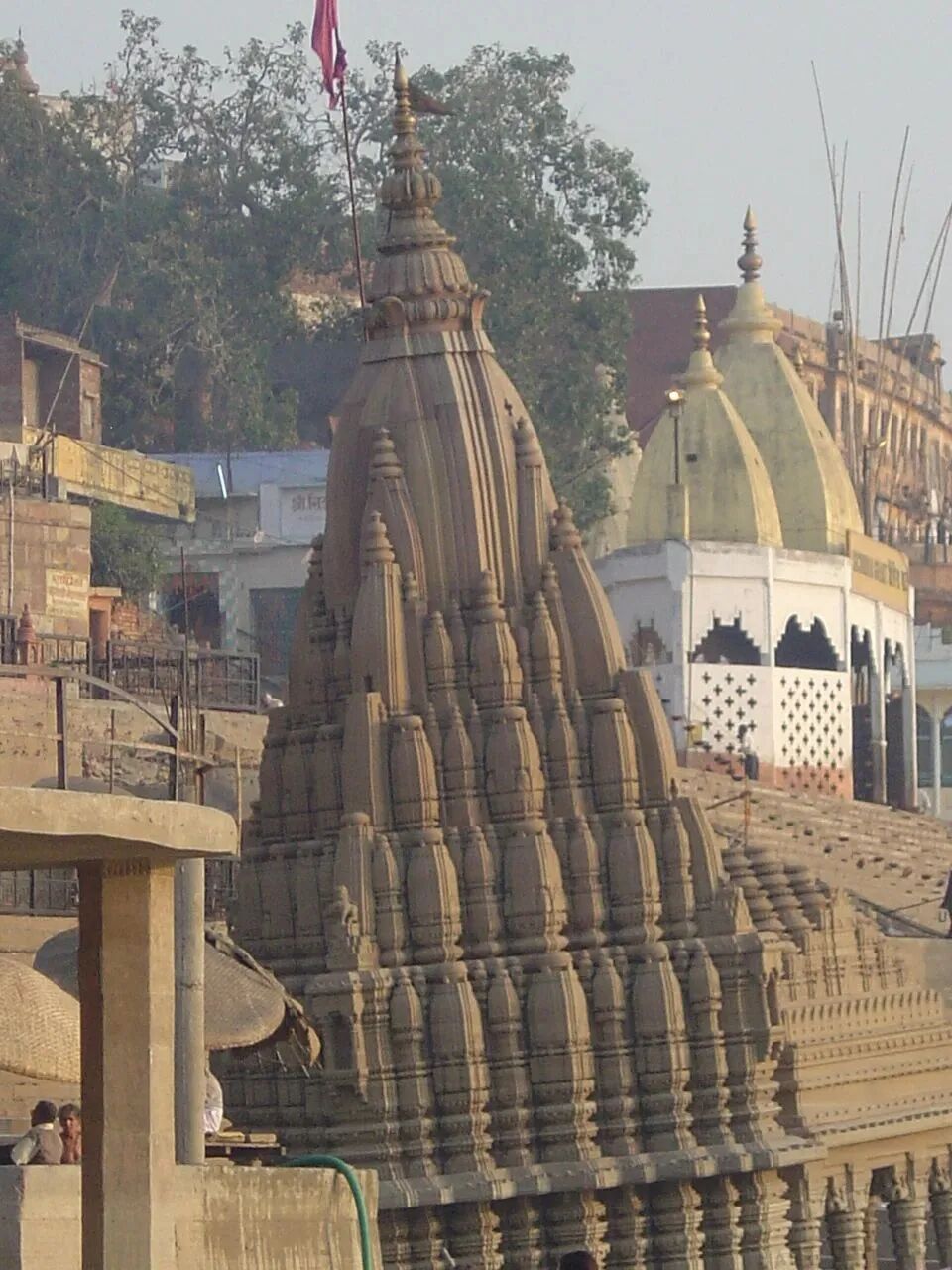 恒河岸边的一座锡哈拉塔,宛如一座比萨斜塔,后面是耆那教的白塔。