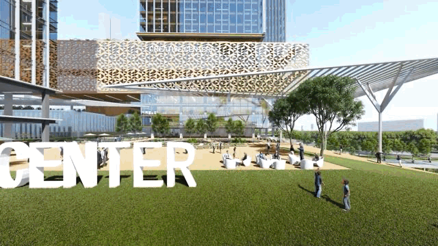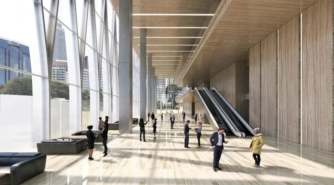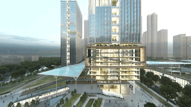 在高层建筑底部,我们特别设计了一条水平交织的AR+公共空间,在建筑与城市的交界面以智慧科技的 “城市客厅”,促进建筑、产业与城市居民生活的融合共生。
