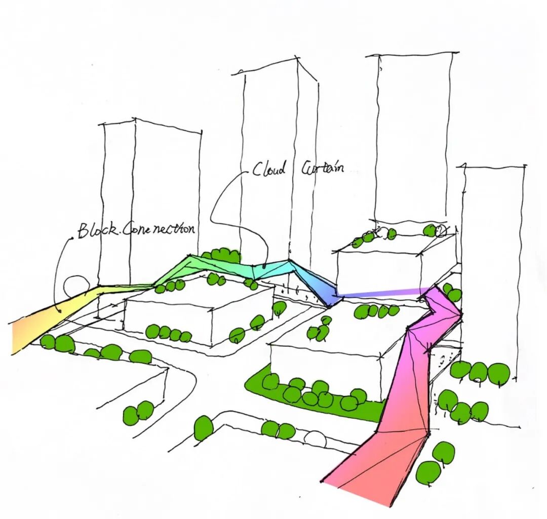 融合虚拟与现实的AR街区围绕在建筑底部,连接地上与地下,如同绚丽的云彩萦绕着错落的群山。艺术地景与体验型商业穿插其中,让ICT产业与城市公共空间完美融合,让公众走近并体验未来科技生活。