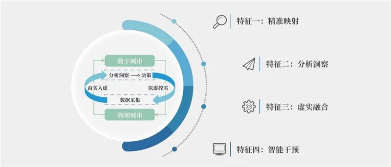 数字孪生城市基本具备4个典型的技术特征, 即物理城市与数字城市的精准映射、数字城市的深度洞察、数字城市与物理城市的虚实交互、数字城市对物理城市的智能干预