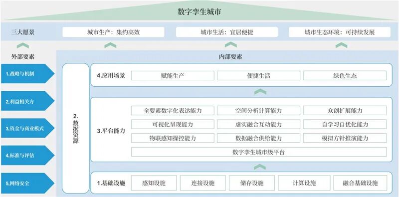 结合全球数字孪生研究观点以及数字孪生城市案例实际,数字孪生城市建设主要涵盖9大要素,呈现“4+5”要素框架, 包含4大内部要素,即基础设施、数据资源、平台能力、应用场景,以及5大外部要素,即战略与机制、利益相关方、资金与商业模式、标准与评估、网络安全