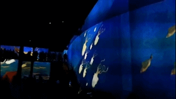 蓝色的背景墙,荡起一圈圈波纹,游鱼在墙上跳跃,好像置身于海边。带有滑动拉门的移动背景,充满蓝色海浪的房间,让人想起北斋的《神奈川冲浪里》。值得一提的是,展馆的音乐灵感也来自北斋的巨浪。这部数字作品伴随着精心挑选的配乐,从著名的坂本龙一的音乐到克劳德·德彪西的音乐 La Mer(“大海”),以及日本鼓节奏,营造出海边意境。