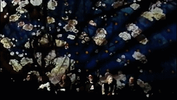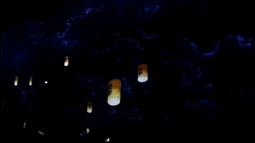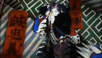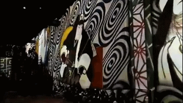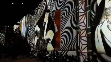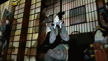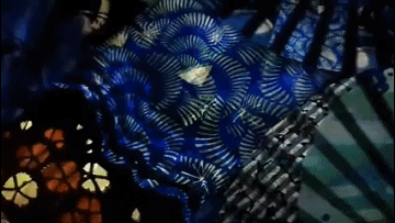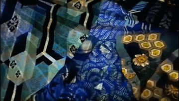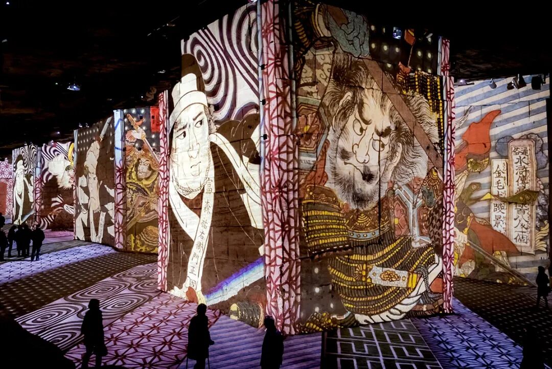 满屏的折扇、飘落的樱花、夜空的灯笼,身材魁梧,舞姿僵硬的武士,交替出现在墙上,好像柔弱美和力量美交替并行。如果说武士是忠诚的、勇猛的,那么艺术则是包容的,多元的。这些被艺术化的武士,被色彩包围着,成为跟随光影“动”起来的经典画作,尽管他们看起来表情或滑稽或夸张,但观众不会觉得他们冰冷和恐怖。
