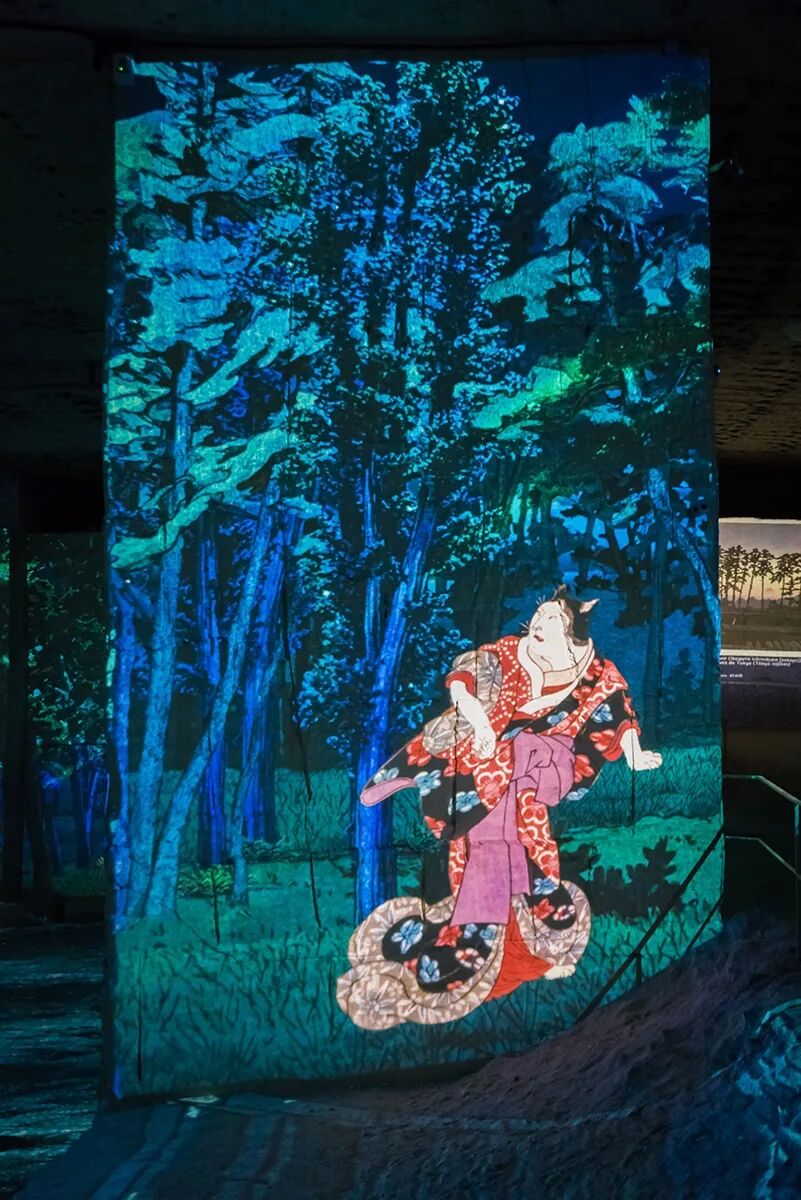 前期,丹尼·罗斯工作室进行了大量的制作和创意工作,对浮世绘艺术运动的多样性、现代性和美感进行了广泛的概述,将音乐家、造型艺术家、演员、代码艺术家和 3D 设计师联合起来,以作品唤起想象中的日本,以空灵的美,对比鲜明的颜色还原日本古老的艺术,以现代技术加持古典美,让观众可以近距离感受江户时代(1603-1867 年)蓬勃发展的木版画和绘画。