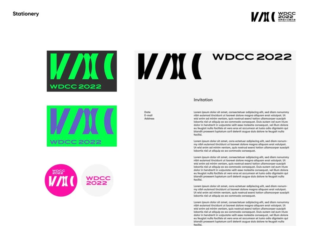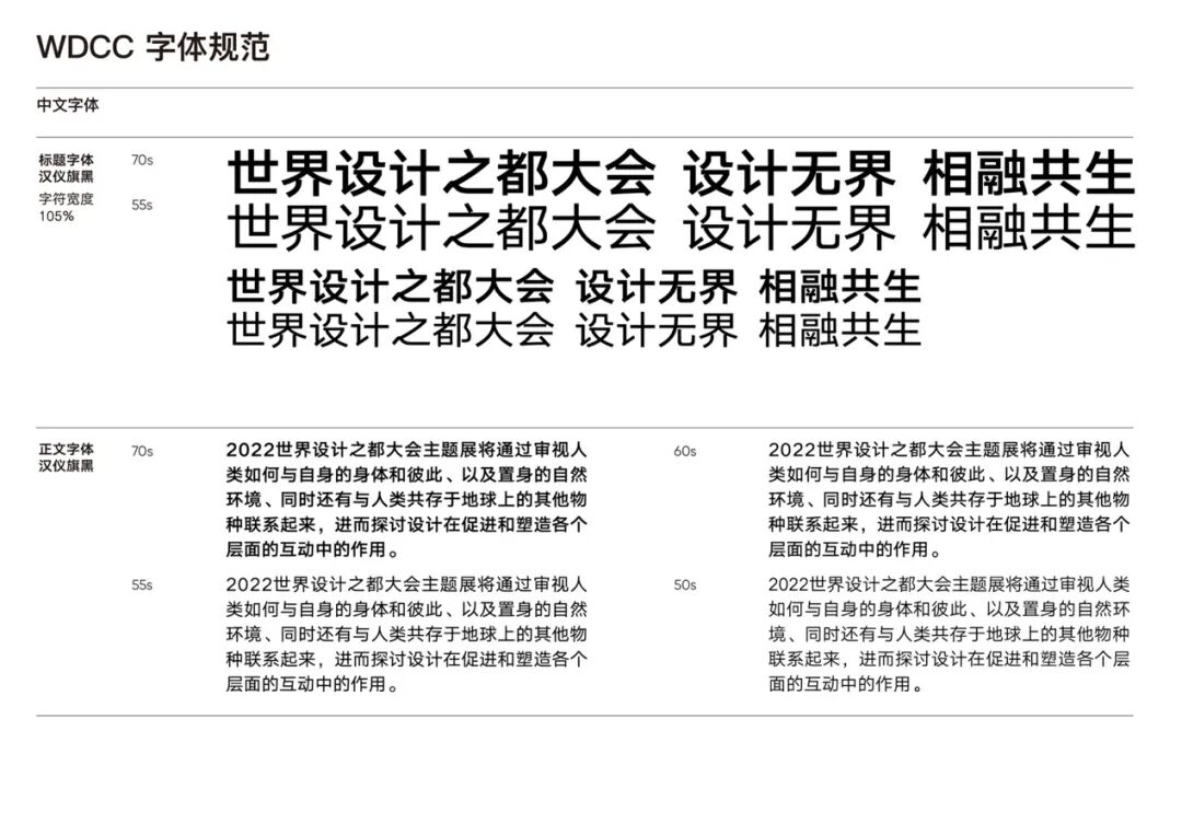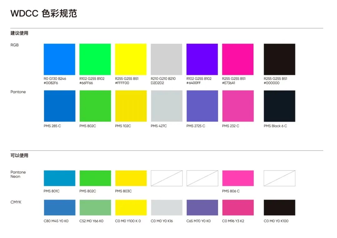 LOGO彩色版本适用于动态/高分辨率、主视觉KV呈现、活动与展览空间、屏幕与网页端等情况下;单色版本的LOGO也十分简洁并具有视觉冲击力,适合静态/低分辨率、作为WDCC活动品牌标志独立出现或与其他品牌同时出现时,以及其他物料及周边设计衍生品中。