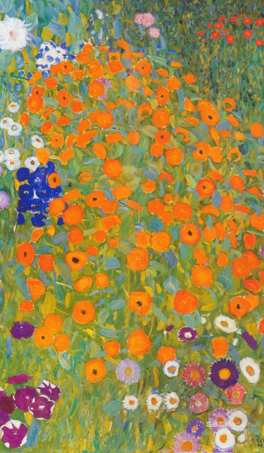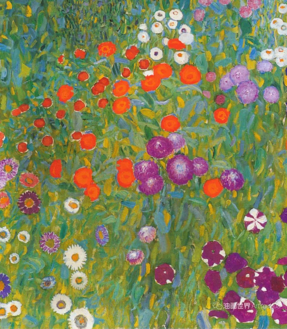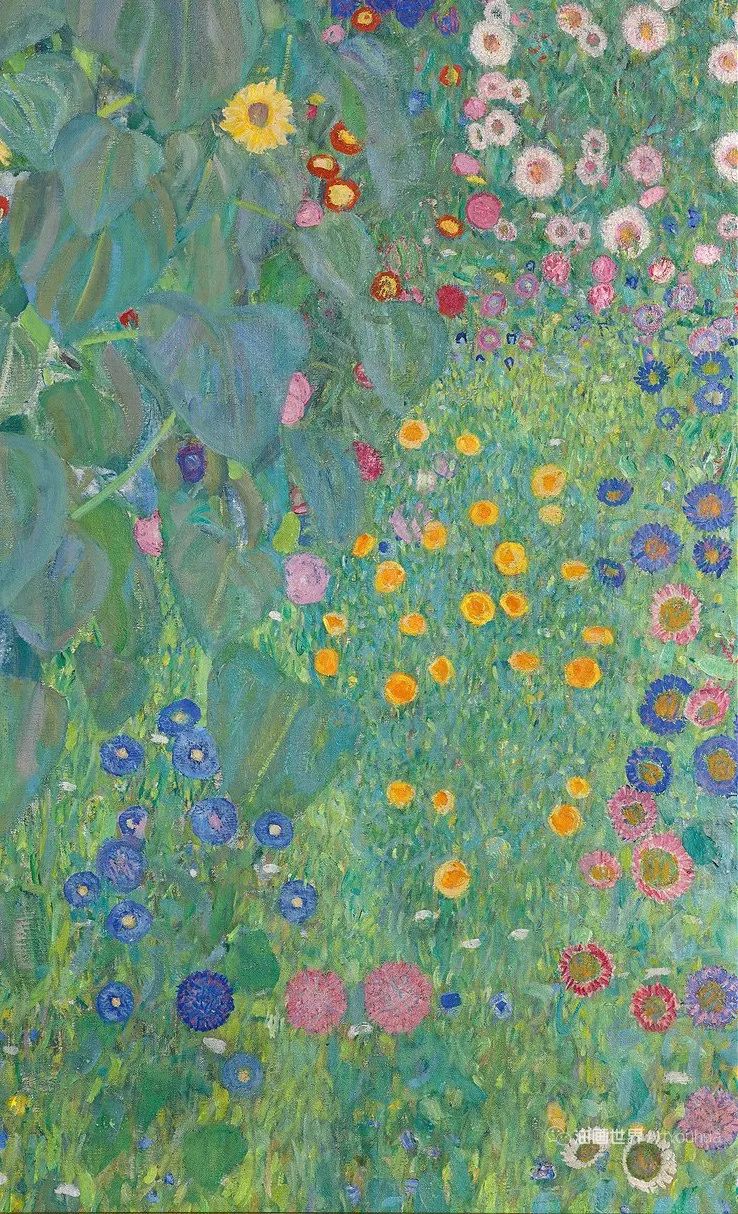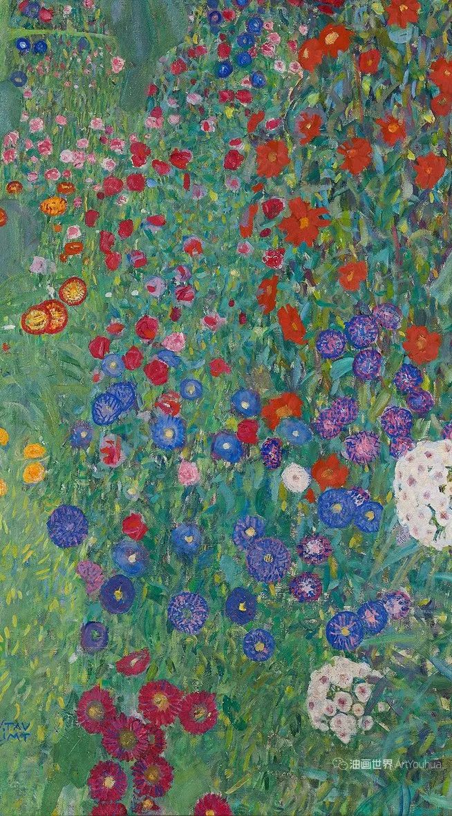 克里姆特的肖像画作大多为委托作品,而风景画作则揭示了艺术家内心的另外一面,富有实验精神,是其艺术作品中不可或缺的一环。在风景画作中,时常可见人物的联想——在此作中,色彩明艳的花丛三角构图背后,隐约能看出女子的身影。《花草农园》与克里姆特多件最广为人知的肖像画于同期完笔,包括描绘阿黛尔·布洛赫·鲍尔的金色肖像,以及金箔装饰的《吻》。画作以轻松愉快的基调娓娓道来克里姆特的小故事。每年夏天,克里姆特都在家人与朋友的陪伴下,来到阿特尔湖畔度过3个月,他的终生伴侣、著名设计师艾米莉·芙洛格也相伴左右。《花草农园》灵感源自当地农夫的乡村花园,里面杂植了许多雏菊与玫瑰,欢快灵动的色彩令人目眩神迷。