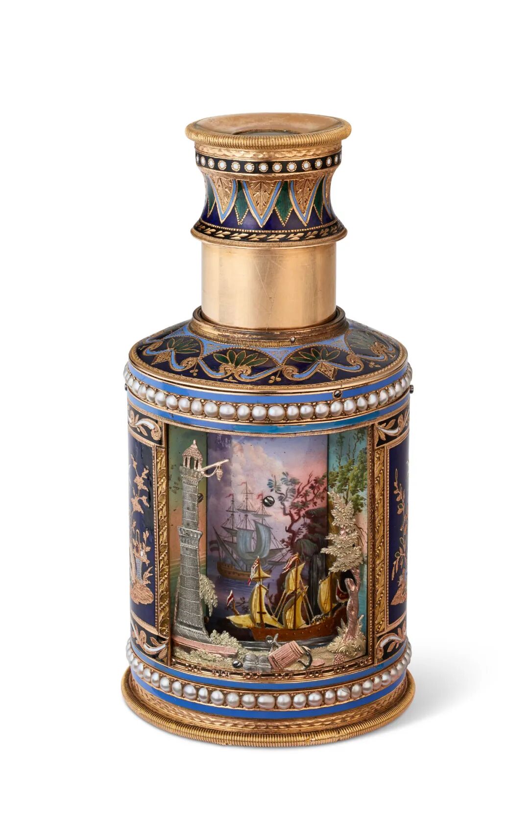 一件约1805年出品的瑞士多功能小型望远镜即将上拍,最高估价600,000美元。这个小型望远镜以黄金、珐琅打造,镶嵌以珍珠,描绘有繁复的风景和花鸟图案,结合了音乐机芯和表盘,这种结合珠宝、音乐装置和钟表功能的小型珍品是钟表商兼金匠PIGUET & CAPT的作品特征。