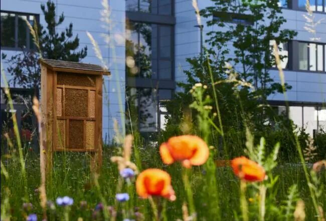 园区内的建筑都展示了一种巧妙的空间效率方法,最大限度地减少了建造的地面面积,并尽可能种植植物覆盖屋顶和外墙,并在设计时考虑到了整个建筑生命周期,不仅避免了施工过程中不必要的浪费,而且当它们达到使用寿命时可以很容易地拆除,并且它们所包含的材料可以有效地回收。园区区块 1 八座办公楼屋顶上的光伏阵列每年共产生超过 400000 千瓦时的电力;其他区块的建筑上也安装了光伏系统,光伏与木建筑的结合助力西门子确保所有新建建筑获得国际LEED计划的金级认证。