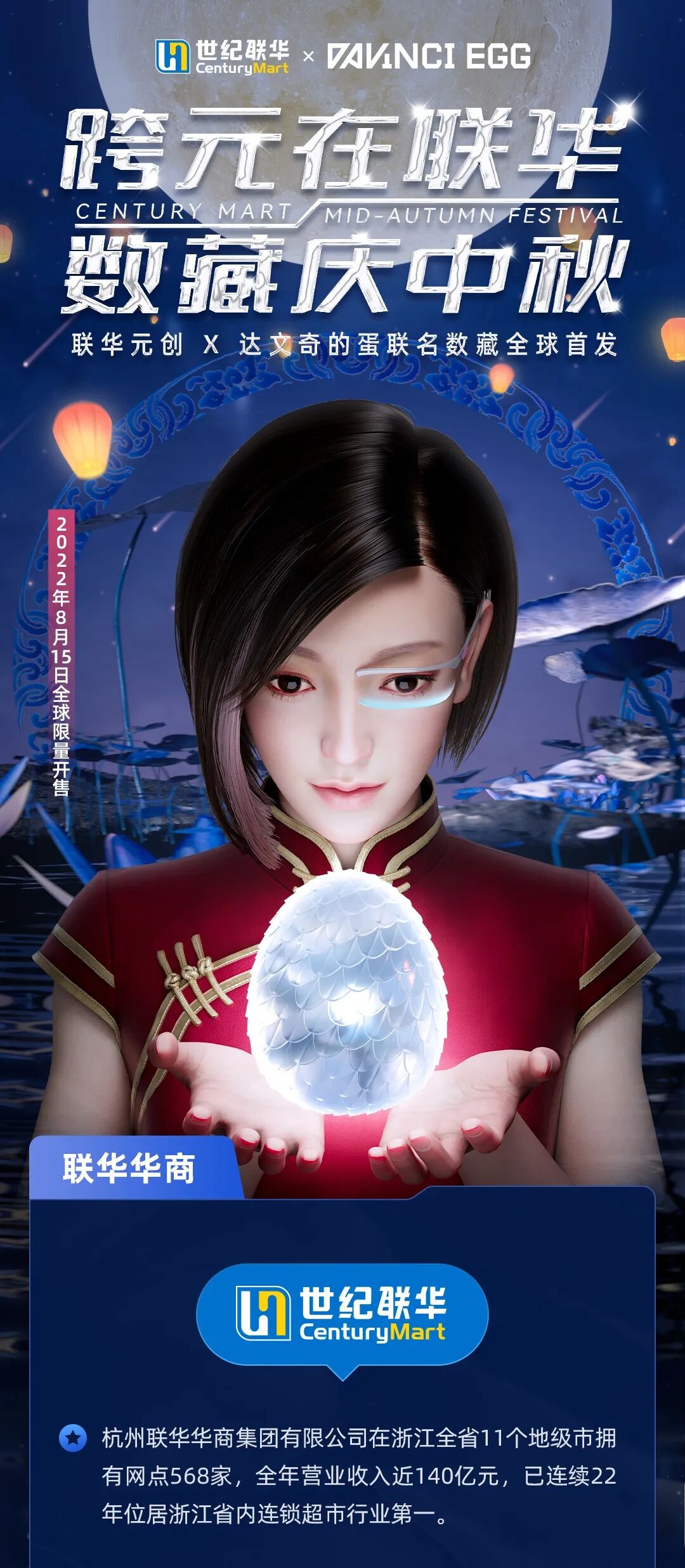 「联华虚拟人li lian X 达文奇的蛋联名款数字藏品」系列中秋限定数字藏品由中国美院进行美术及视觉设计,将中秋节传统文化背景与元宇宙科幻美学风格相结合,进行了全新风格的尝试与诠释,用现代绘画艺术展现了传统文化的风采与元宇宙未来的碰撞。