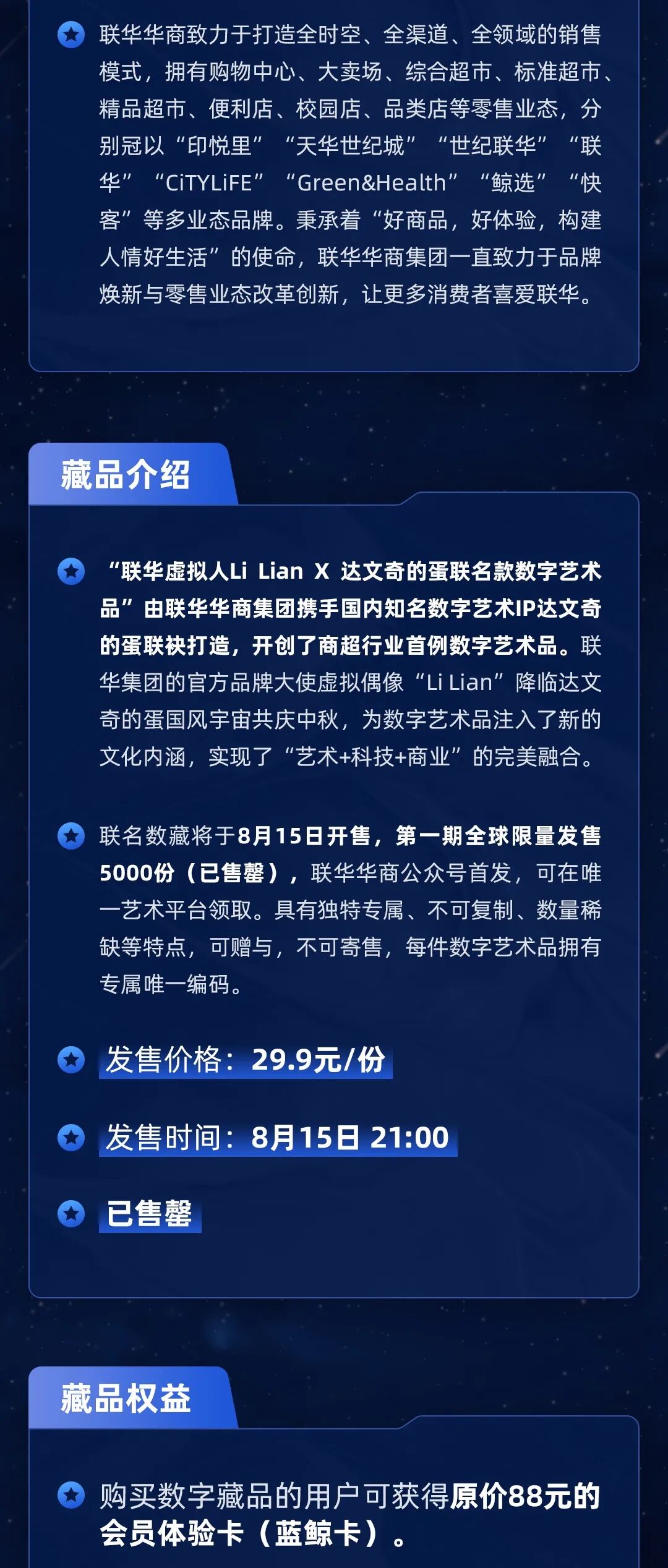 8月15日21点,联华华商携手达文奇的蛋、原创精品数字艺术IP达文奇的蛋以及中国美院,正式推出了“联华虚拟人Li Lian X 达文奇的蛋联名款数字藏品”,在唯一艺术平台-唯一云上一经上架并售罄,获众多年轻消费者追捧。新增数千注册用户。宣传覆盖浙江线下世纪联华商超、唯一艺术社群、联华华商社群等,被多家媒体报道。