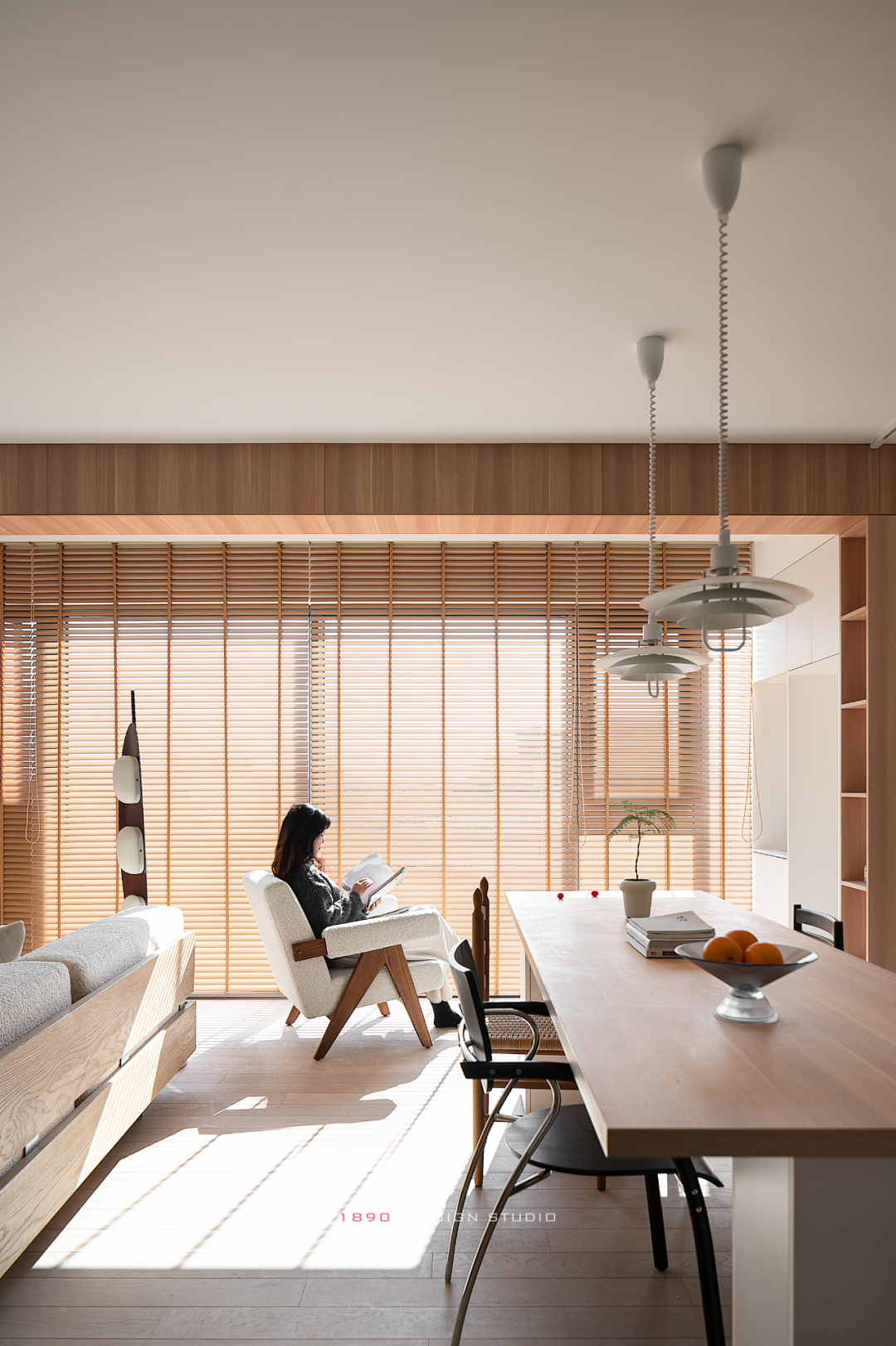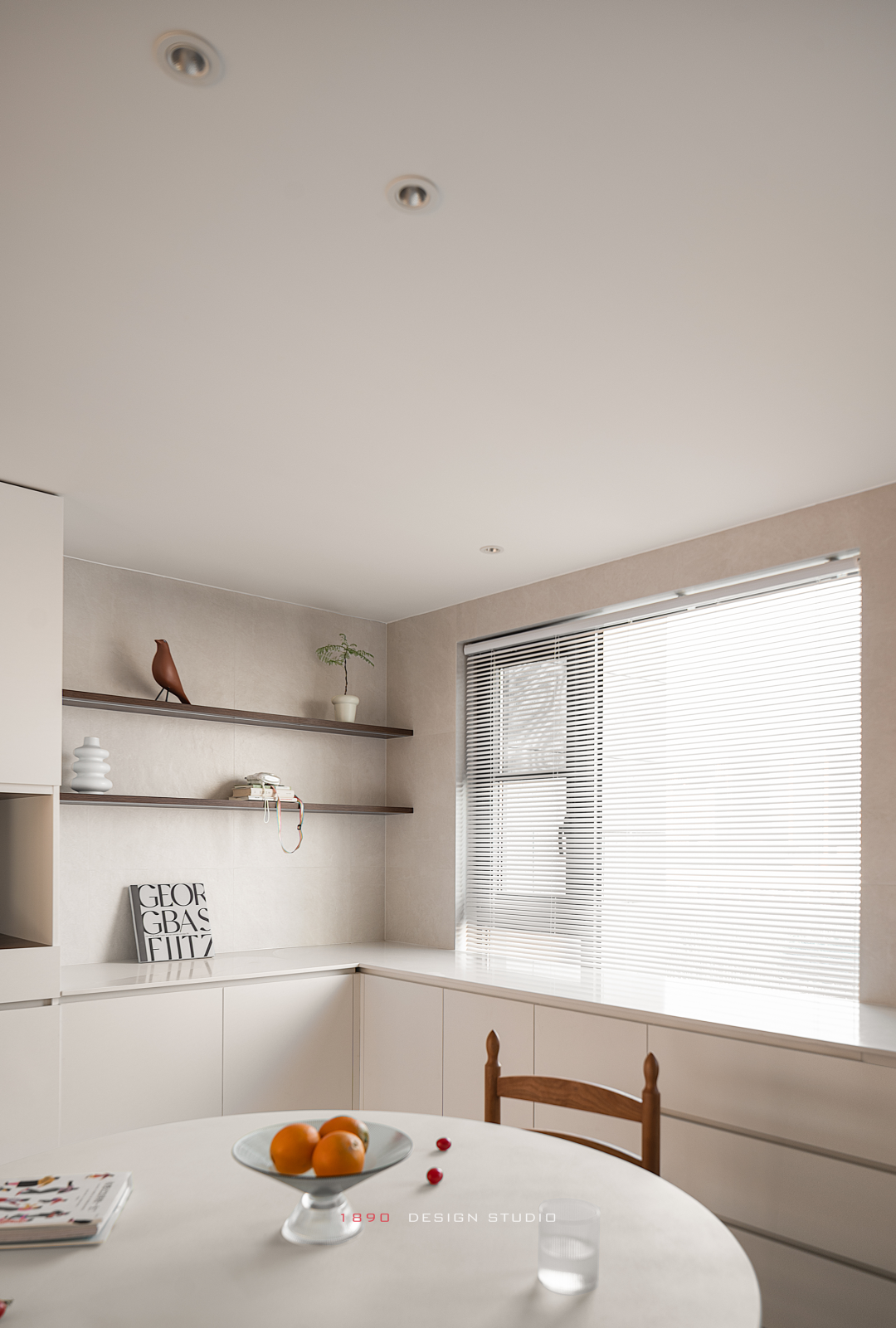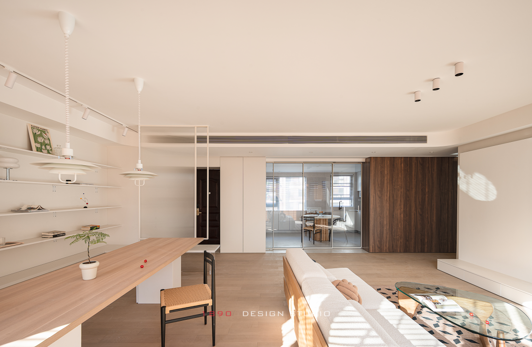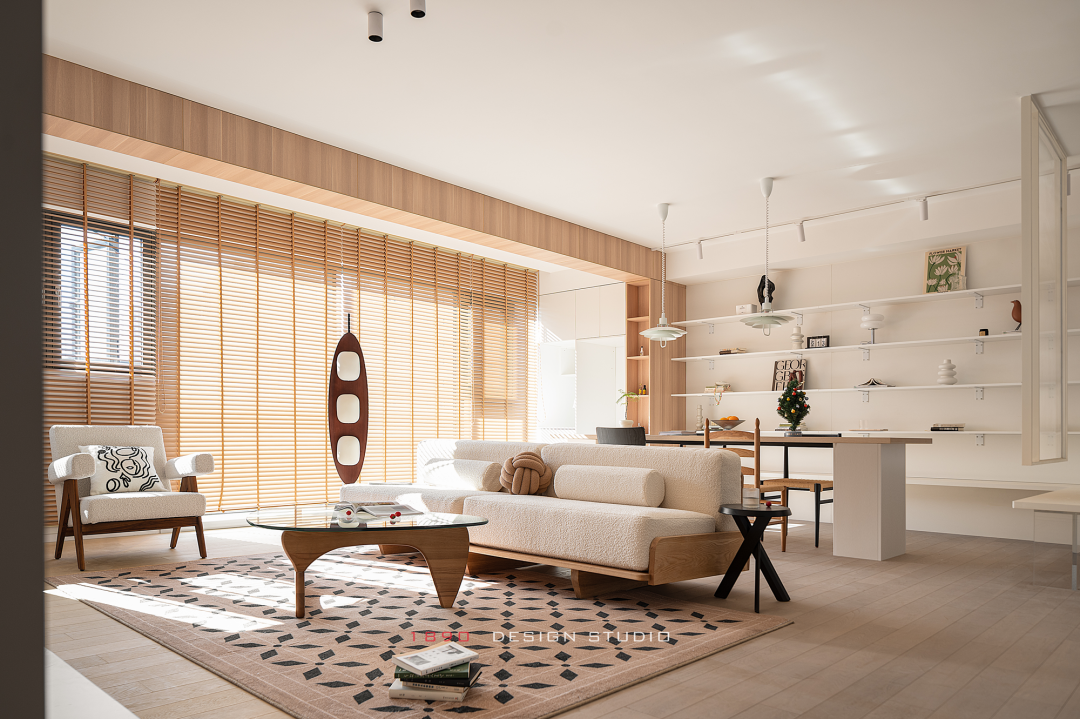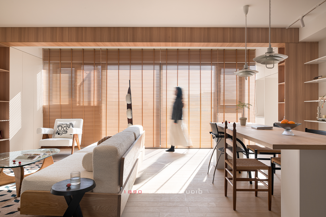 开放柜和梁体连接组成木色的围边,并非出于界定的考虑,而是在白色的空间中给人以亲和力,梁体也不再是生硬的形态。木色递进到窗边是整面的百叶帘,身处城市之中,通过窗帘来放大高层空间的采光优势和变化,让光感代替窗景成为白日最好的装饰。