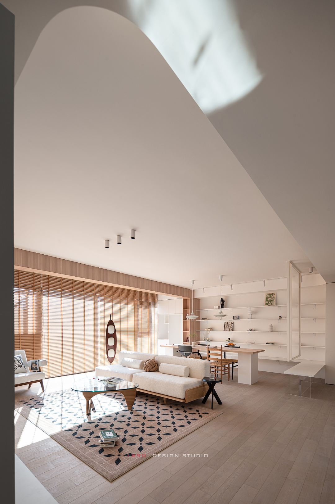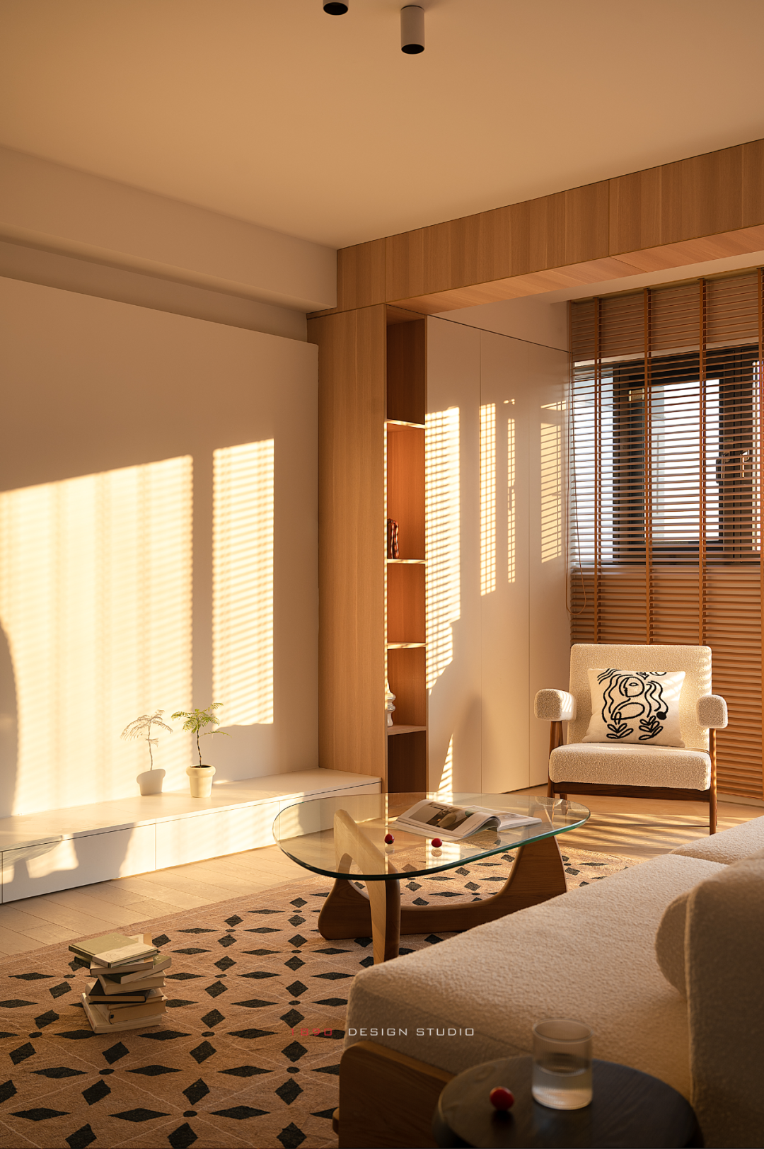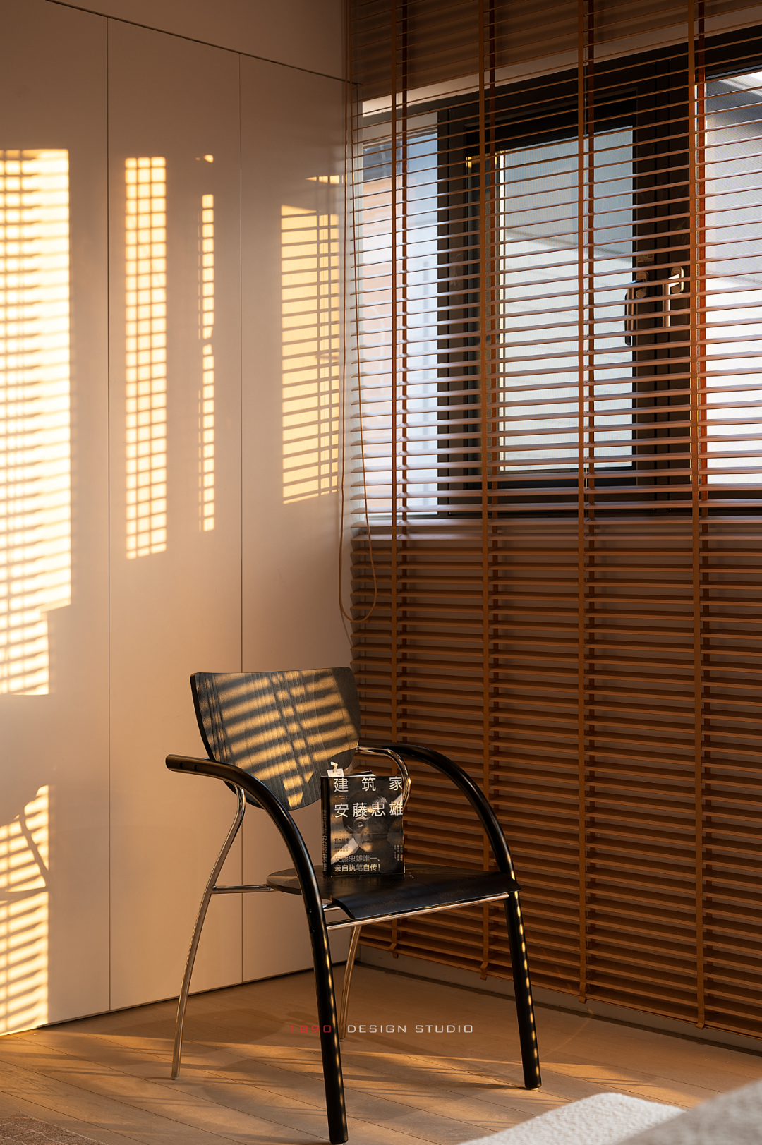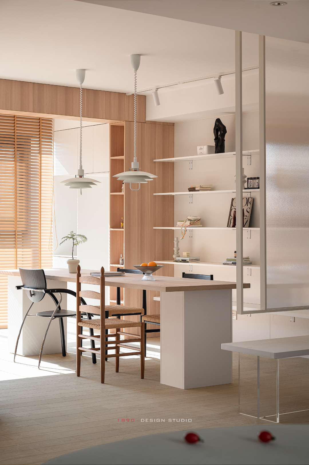 开放柜和梁体连接组成木色的围边,并非出于界定的考虑,而是在白色的空间中给人以亲和力,梁体也不再是生硬的形态。木色递进到窗边是整面的百叶帘,身处城市之中,通过窗帘来放大高层空间的采光优势和变化,让光感代替窗景成为白日最好的装饰。