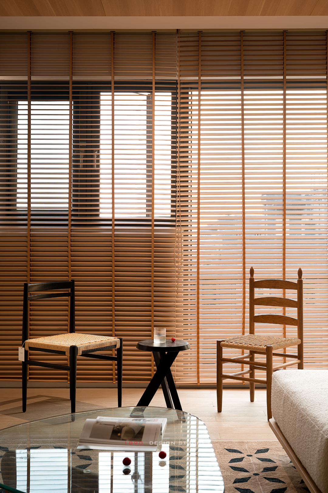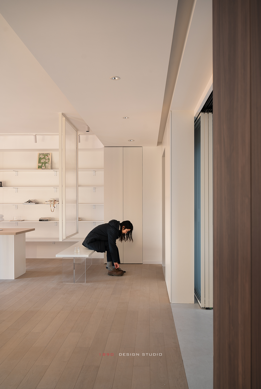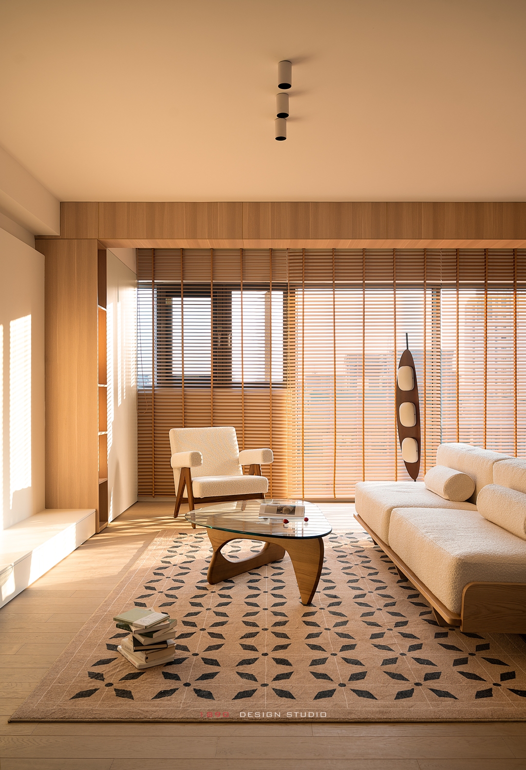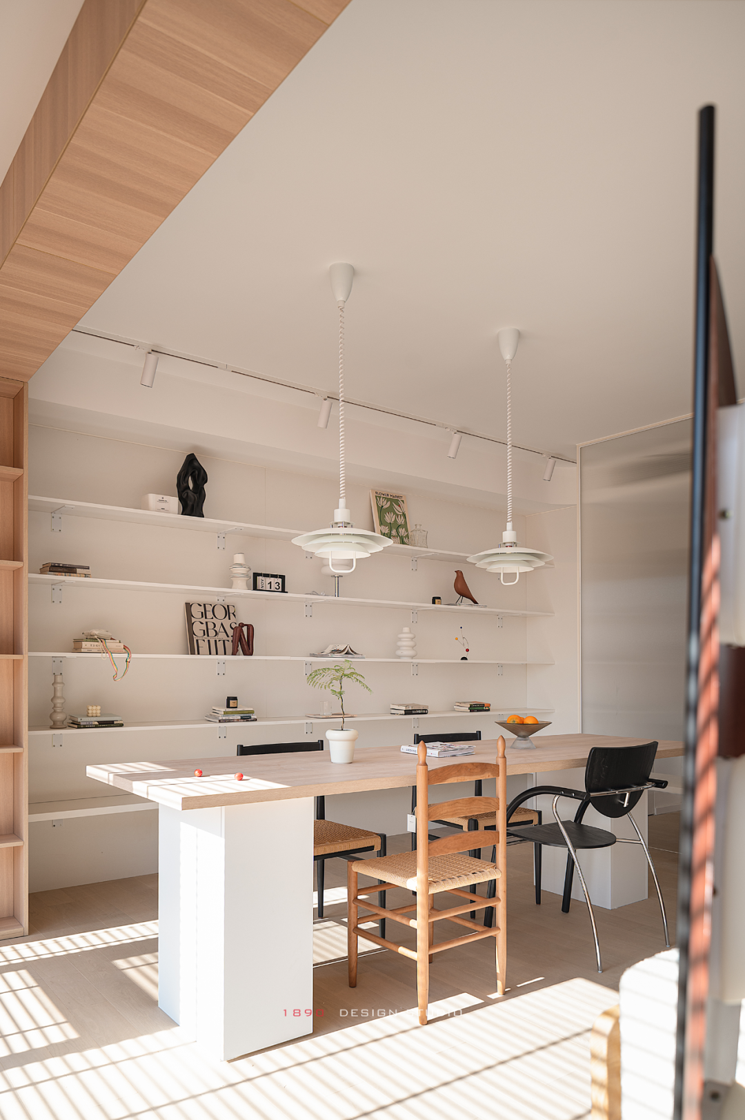 开放柜和梁体连接组成木色的围边,并非出于界定的考虑,而是在白色的空间中给人以亲和力,梁体也不再是生硬的形态。木色递进到窗边是整面的百叶帘,身处城市之中,通过窗帘来放大高层空间的采光优势和变化,让光感代替窗景成为白日最好的装饰。