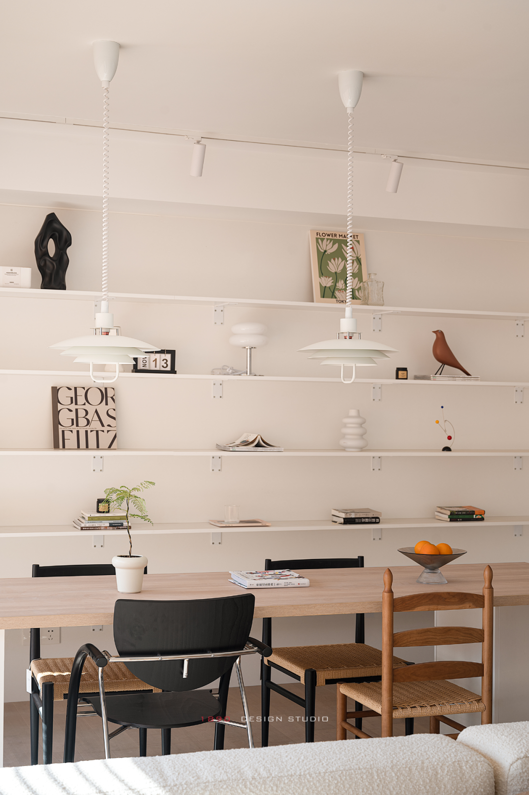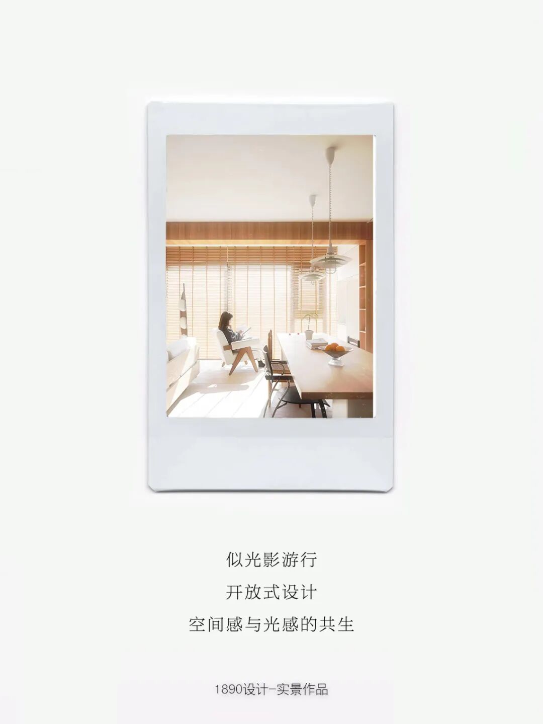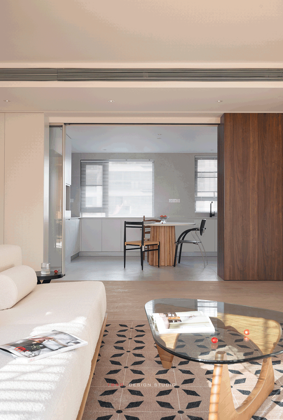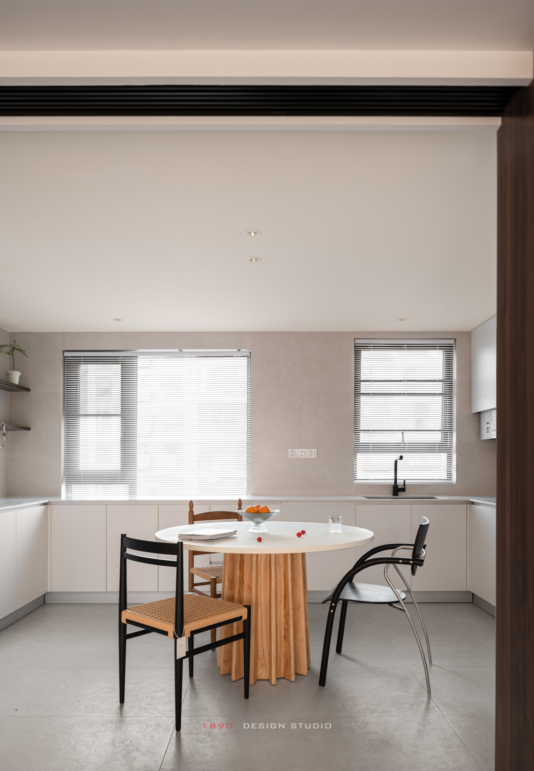 开放柜和梁体连接组成木色的围边,并非出于界定的考虑,而是在白色的空间中给人以亲和力,梁体也不再是生硬的形态。木色递进到窗边是整面的百叶帘,身处城市之中,通过窗帘来放大高层空间的采光优势和变化,让光感代替窗景成为白日最好的装饰。