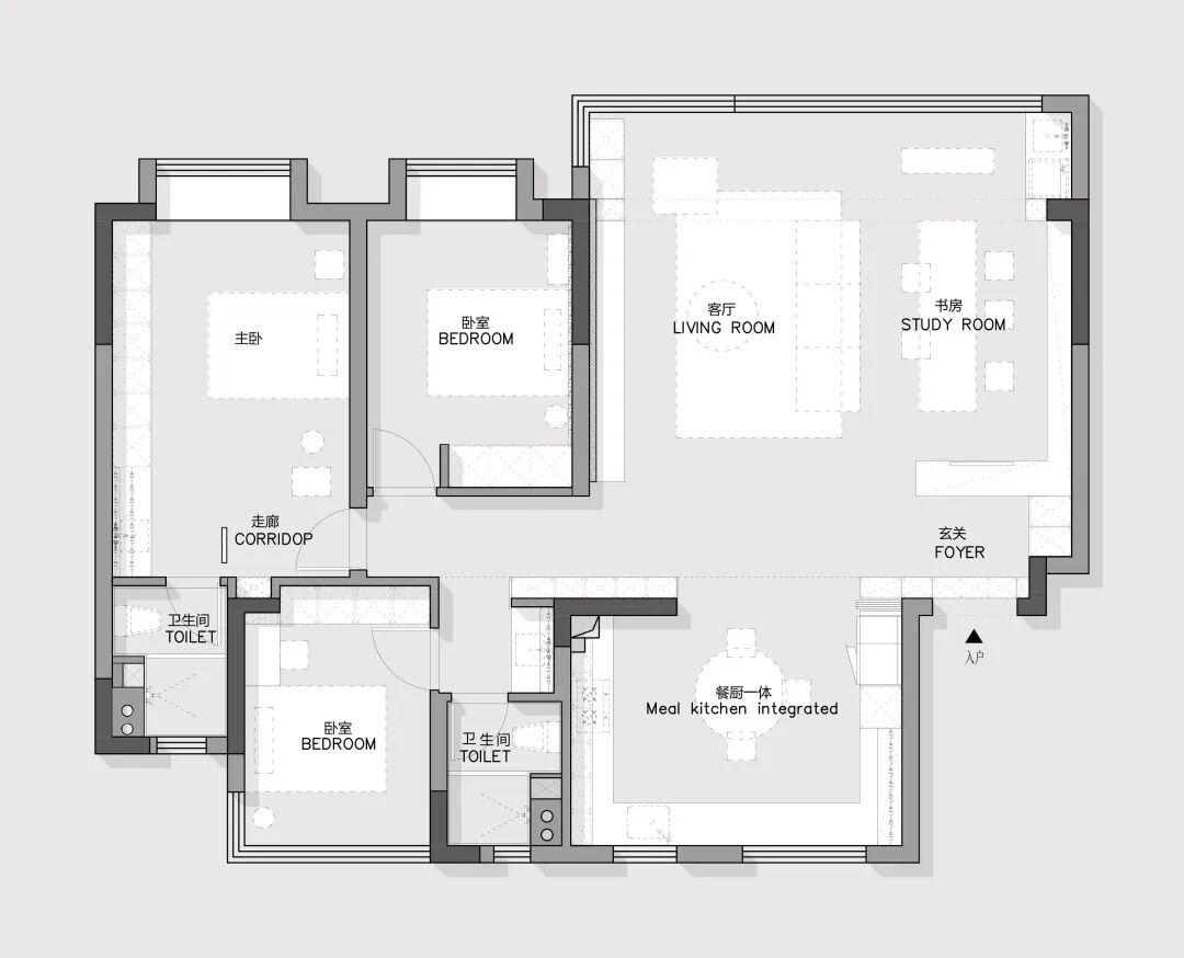 具有开放感的空间,所以内部光照的比重也上升至最大,由此获得的舒适与惬意是饱含温度的。家的主体是共有的活动区域和针对性的功能空间,活动区域愈开放愈包容,平等的支持居住者去创造各种可能下的多面生活。