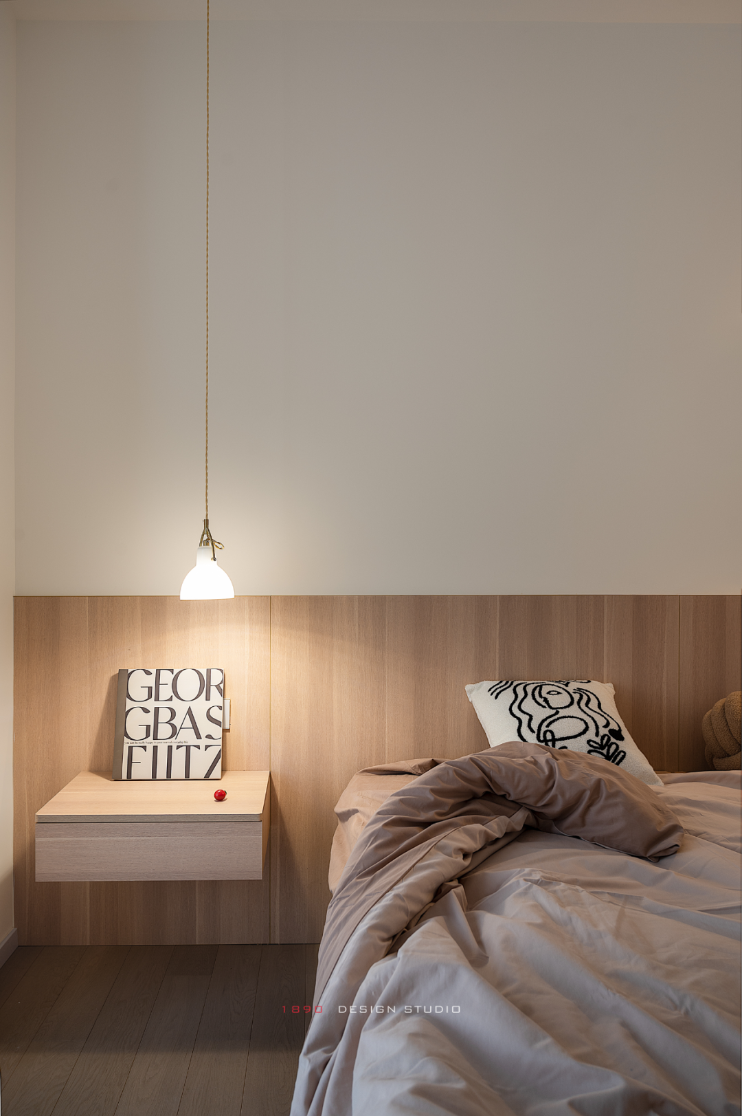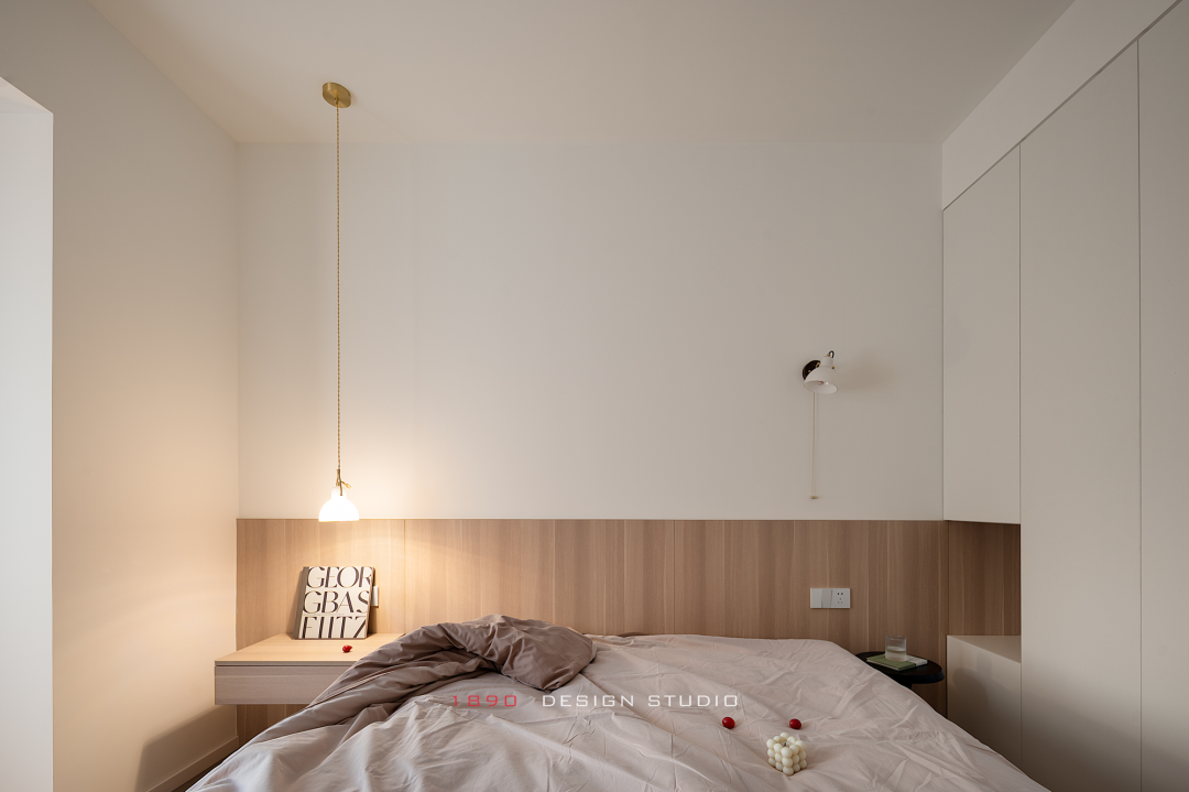 简化功能释放空间,消解空间“局促”的印象。取消床头,木饰面和乳胶漆搭配在墙面形成分色设计,床头柜一边是悬浮的抽屉形式,另一边用衣柜内部空间来补充床头置物需求。