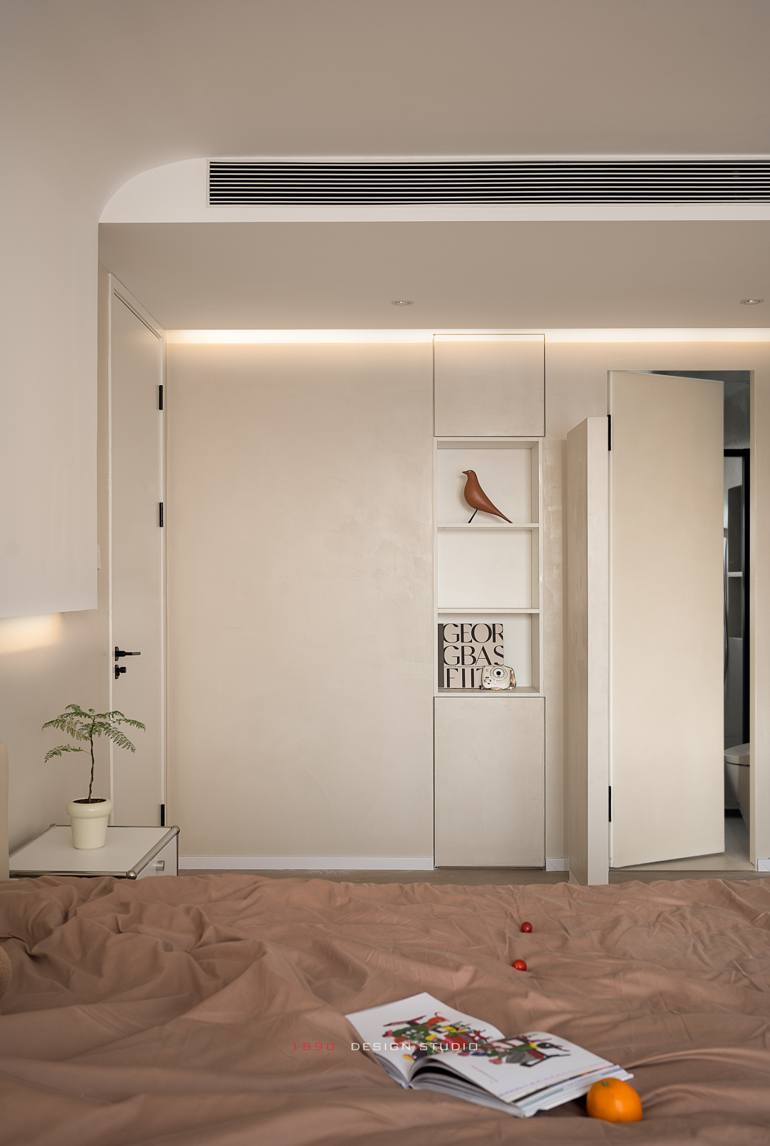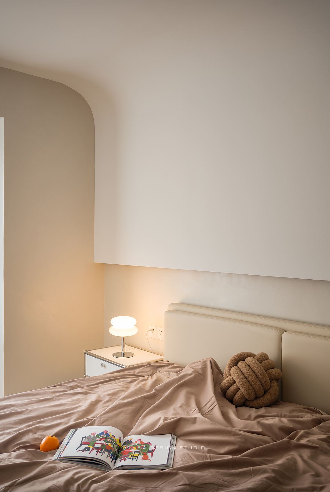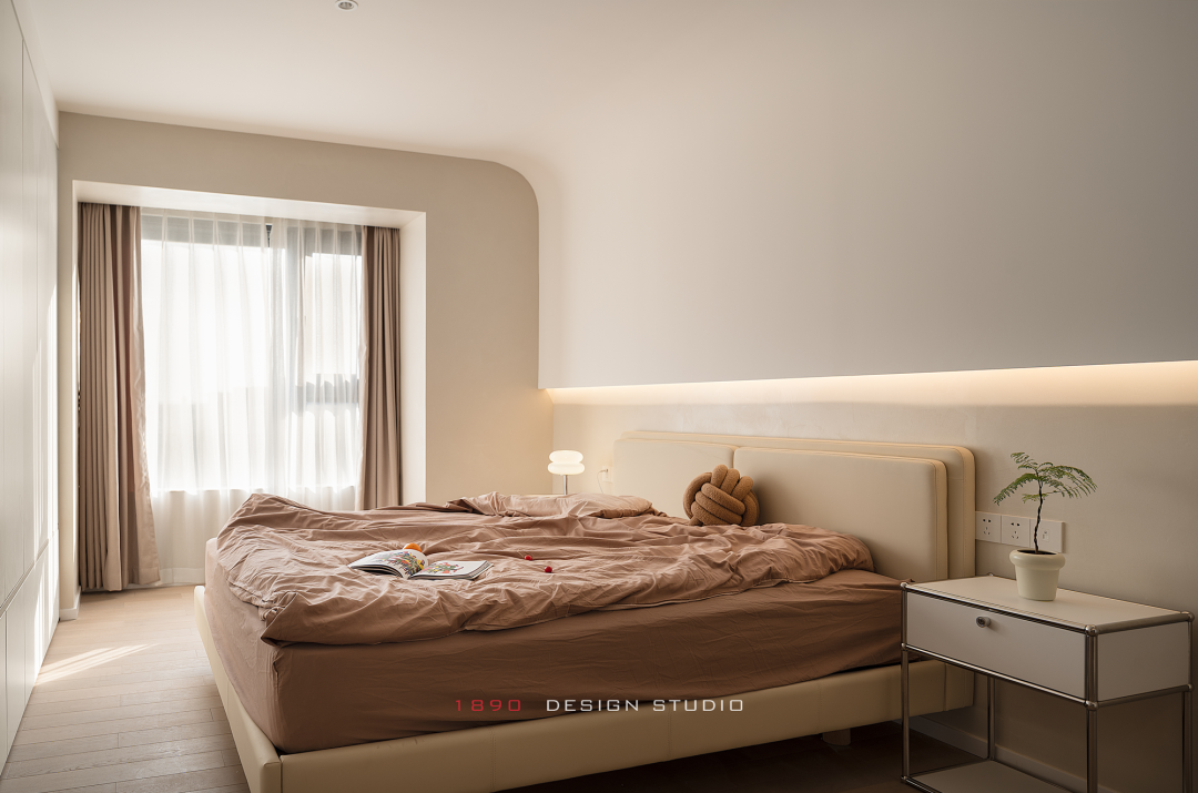 顶部连接下来的弧形对睡眠区形成半包裹的感受,暖黄的底色拼铺出一块有温度的世界,如同带着柔和肤感的手掌的温度,主卧的空间轮廓都被抚平,功能藏在更后面,自夏徂冬,内在的温度没有波动。