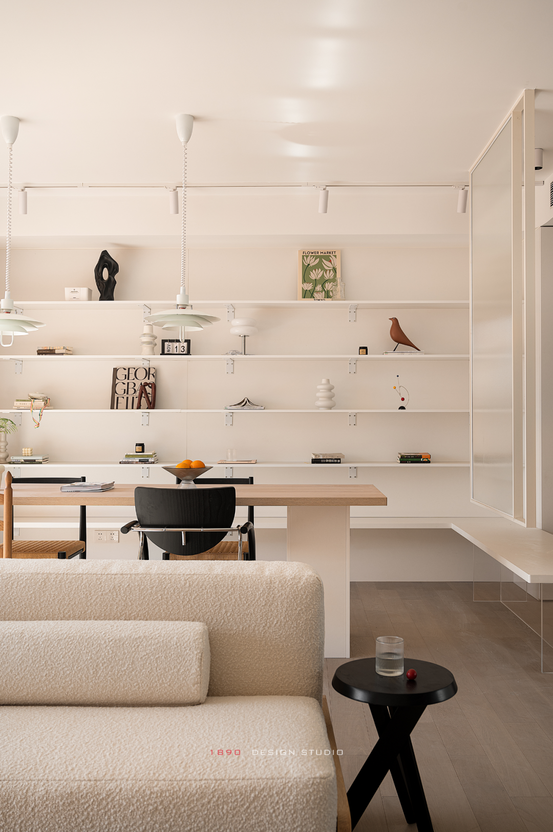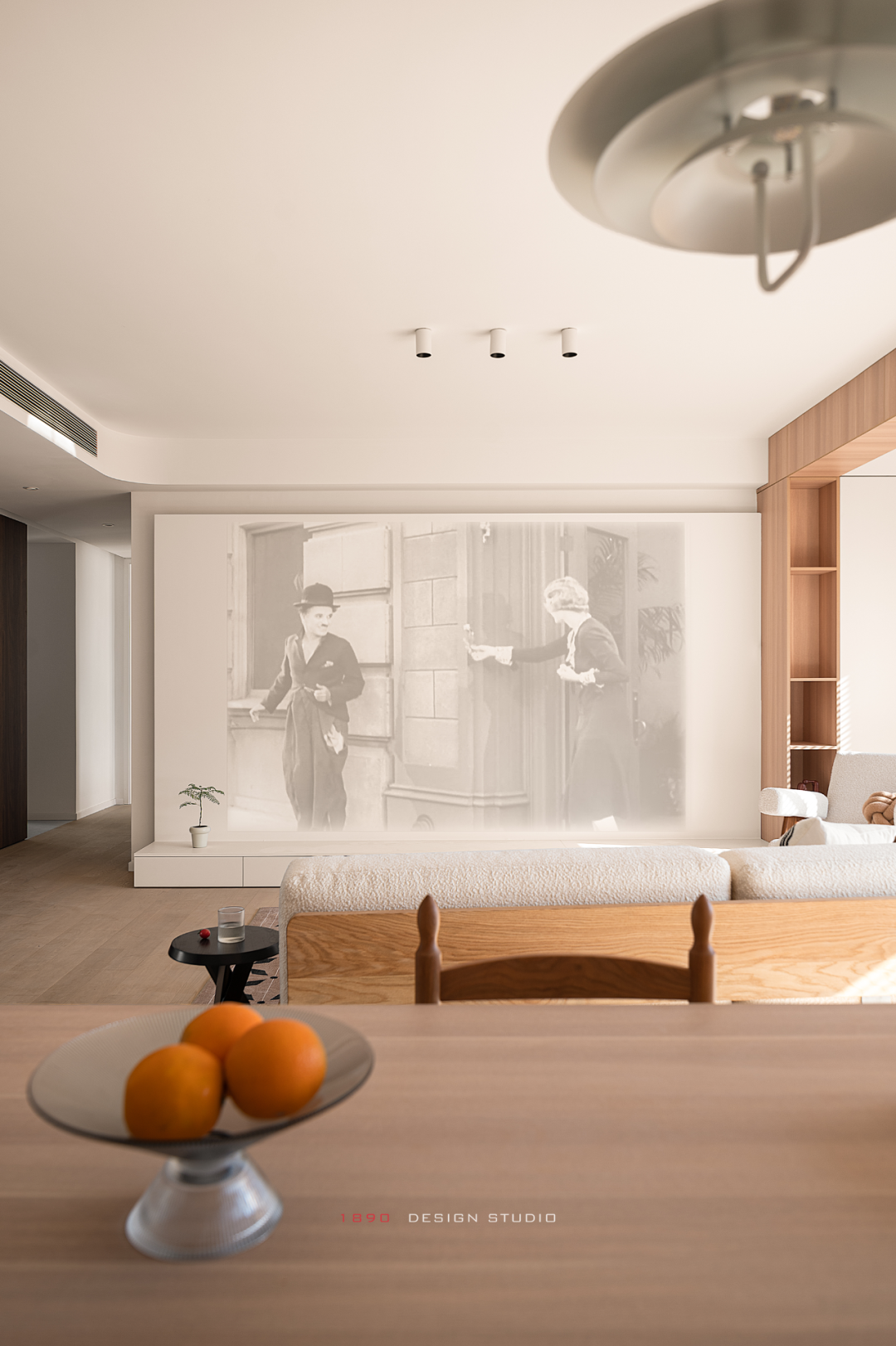 没有电视的背景墙完全留白,自成固定的投影“幕布”,影视功能化作极简的形态打破“客厅中心论”,家的中心早已不是客厅和电视,不是用框架而是用包容的状态让空间直接导向形形色色的行为活动。
