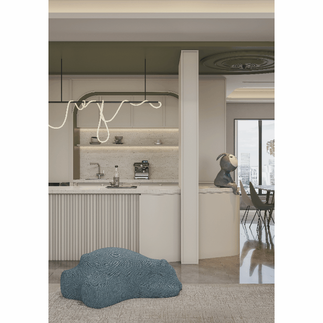 猫狗齐全的温馨之家,由于常住人口为屋主夫妻二人,暂时不需要过多的房间和卫生间,设计师将客卫全部拆除,调整为拥有西厨功能的休闲吧台区,既可以办公,开视频会议,也可以用餐、泡茶、煮咖啡,或做些简易西餐等。