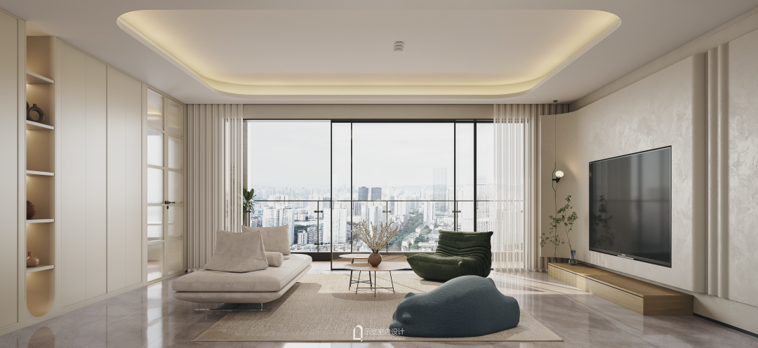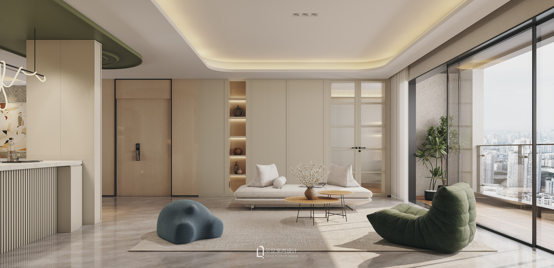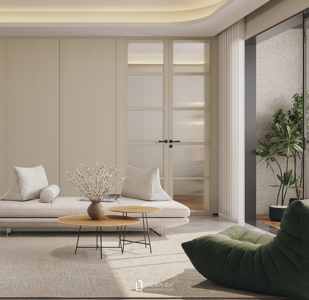 由于交付标准太轻奢,而屋主喜欢轻法的感觉,设计师将两者融合后做减法设计,定位了现代轻法风格。整体以米色系作为主色调,局部融入绿色系点缀,搭配法式线条元素带来的层次感,雀眼木贴皮的纹理,现代软装家居的艺术美感,整体空灵通透中展现着现代华而不媚的质感,每一处都呈现出柔和与雅致。