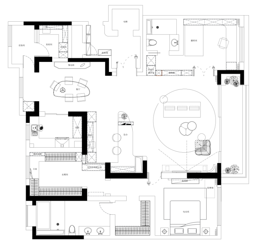 客厅背景墙重新切换位置,换至西面,弧形嵌入式的造型与空间的弧形元素相呼应,弱化了阳台突出的梁柱,又与整体协调统一。