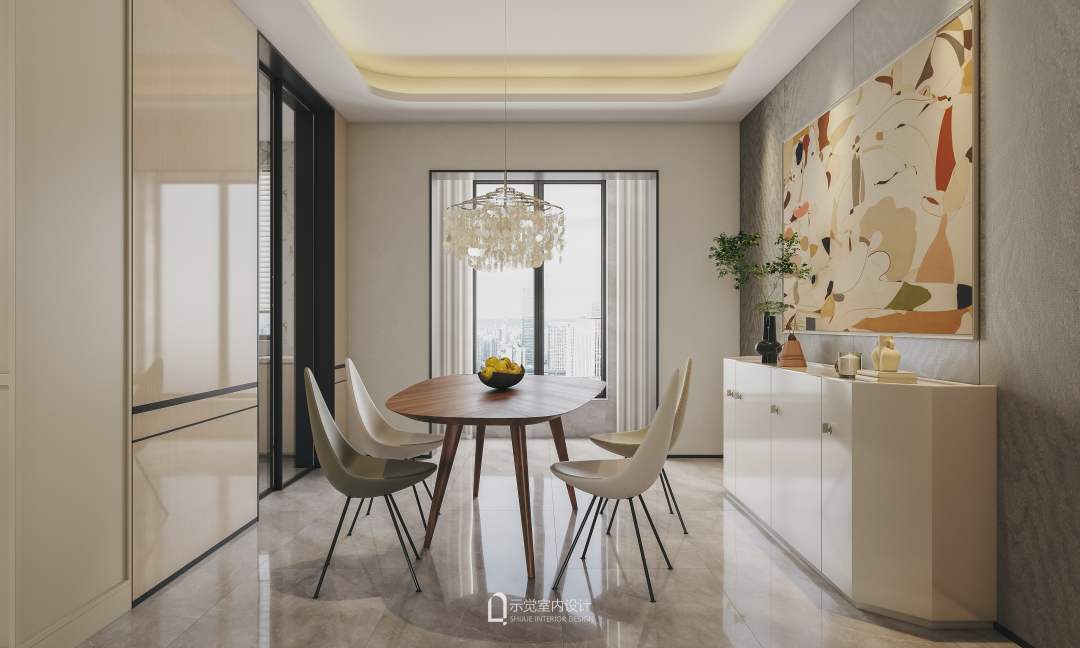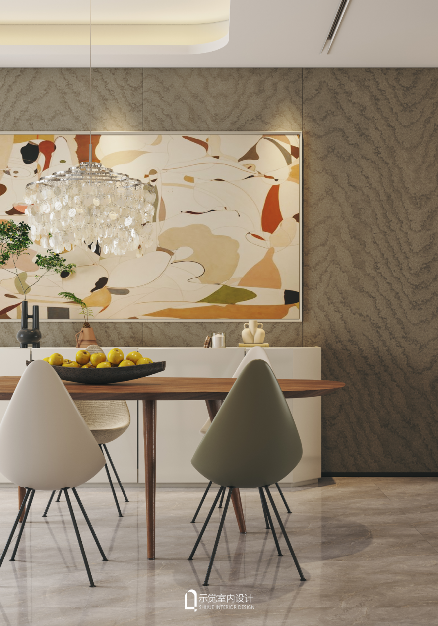 餐厅空间,整体以灰白色调铺设出简洁质感,简雅的背景中,通过吊灯、餐桌、艺术画等元素,打造出生活的仪式感。