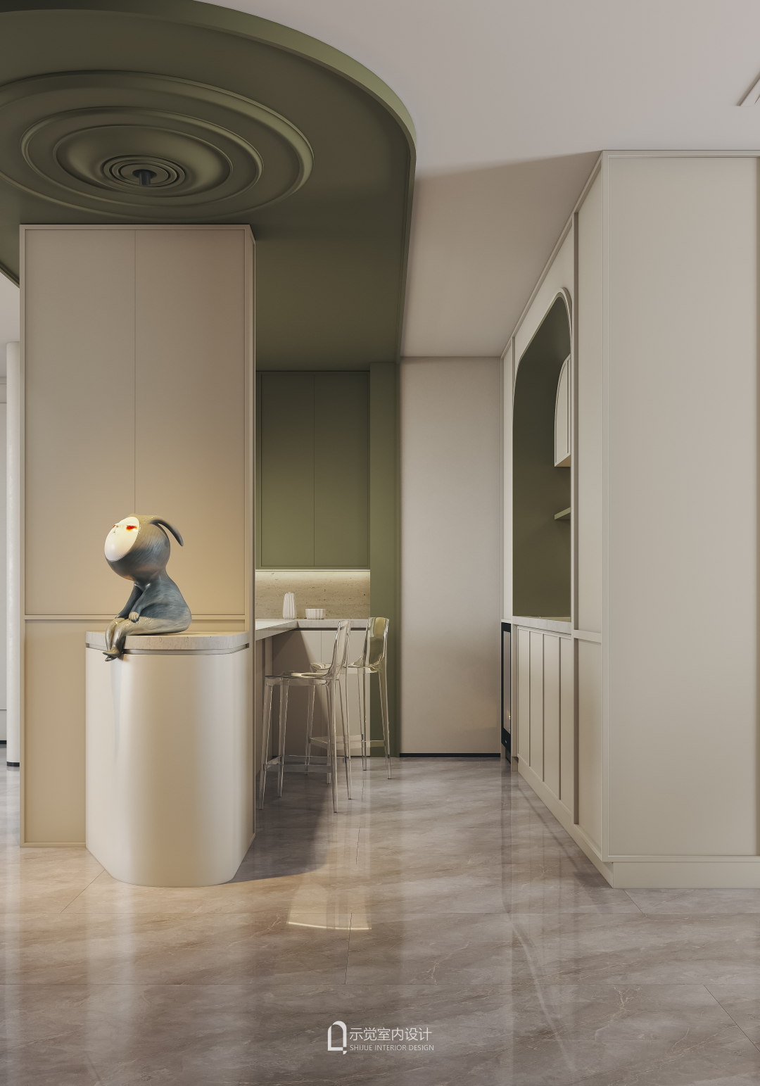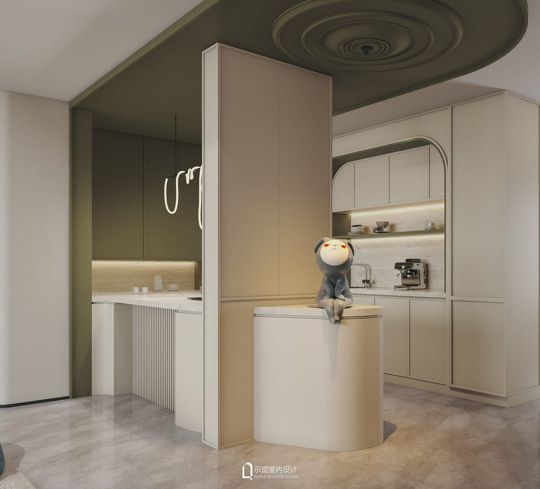 吧台不规则绿色吊顶框,将整个底部的岛台“包裹住”,整体的设计,以吧台为视觉中心,营造出简洁优雅高级的空间感。入户视角下,同样极具艺术欣赏,一眼就心动。
