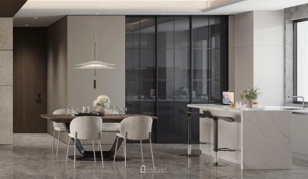 本案,位于龙盛·福新里,256㎡ 精装交付大平层,虽交付标准较高,但于屋主而言,存在空间的浪费,设计师通过对功能梳理、动线规划、逻辑串联,将客卫进行拆除,释放“隐形”空间,并划分给餐厅与玄关。