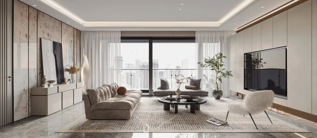 Baxter 主沙发时尚优雅,流线型设计与复古美感相得益彰。落地灯来源于Artemide ,看起来像是来自另一个世界的数字叶子,柔和的光线营造出一种和谐的氛围。茶几来源于Cassina。