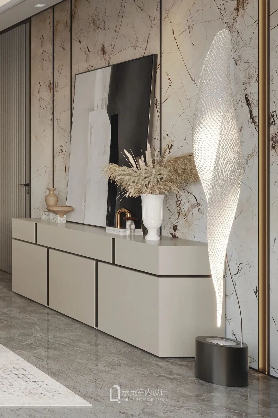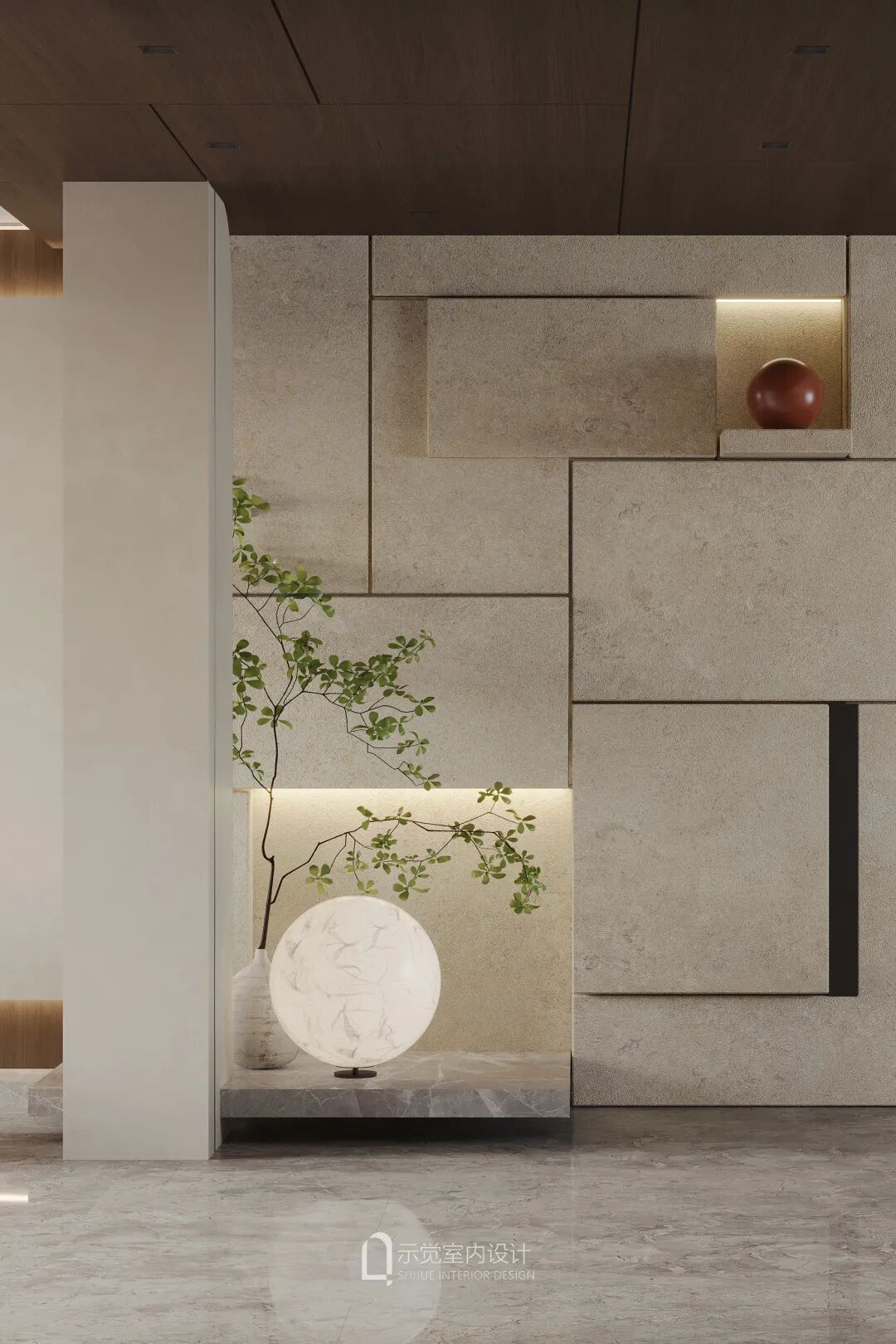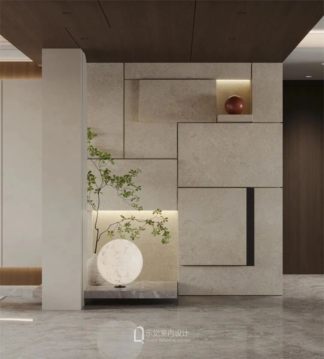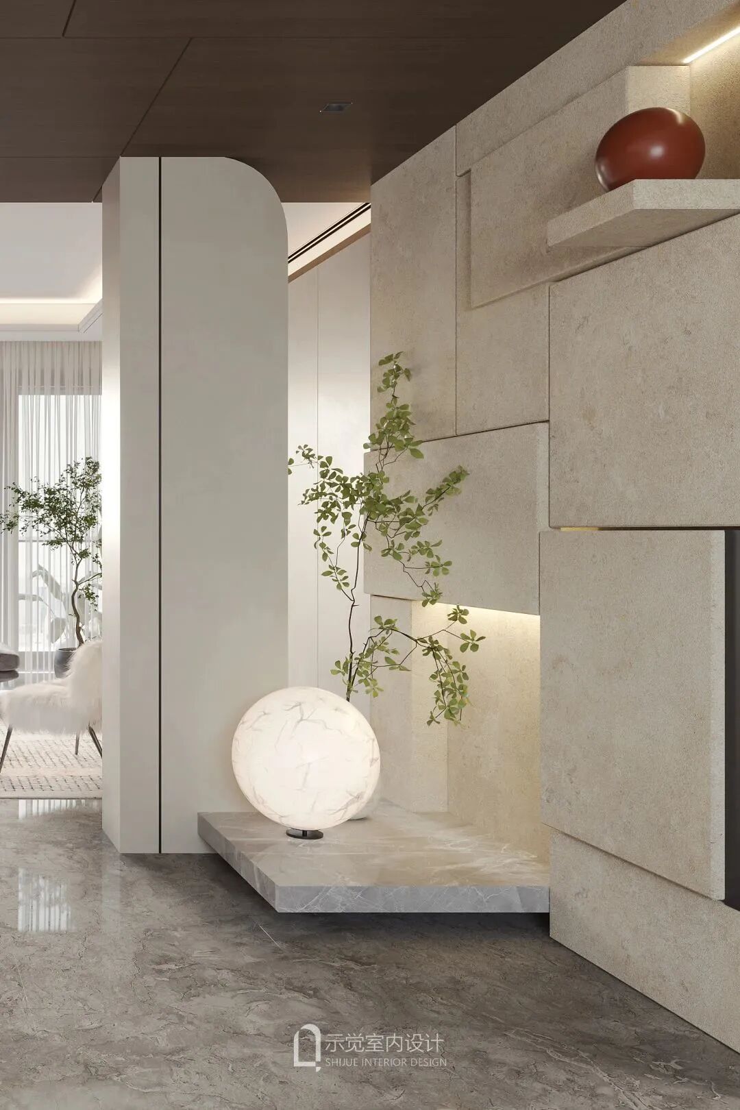 玄关,采用方与圆的结合设计,映射东方文化里的天圆地方,搭建出微妙的平衡。顶上做了木饰面设计,顶部与正面不规则切割的方形进行呼应,圆形元素,以及软装的月球灯等融入,玄关空间充满艺术氛围。