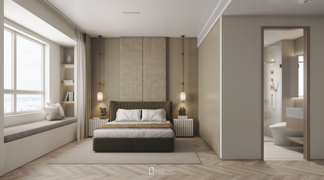高级磨毛的床头硬包,搭配绒布丝滑的主卧床,雅致轻奢。