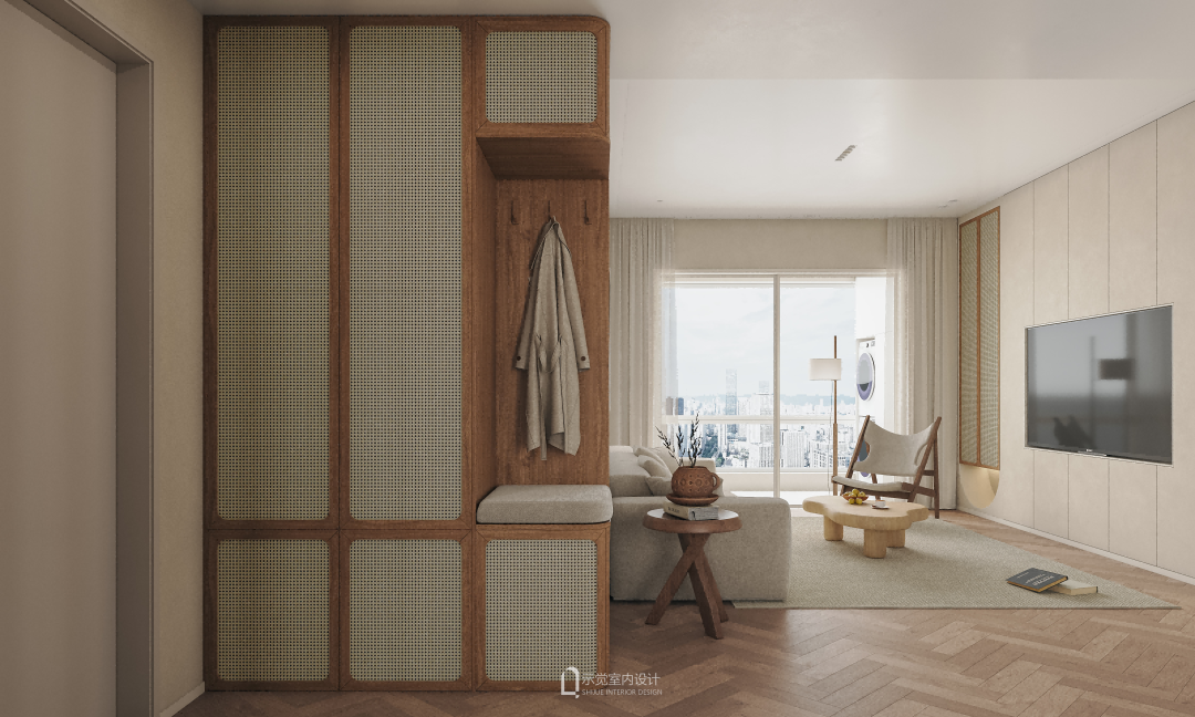 藤编木质的玄关柜,不仅可以容纳鞋子衣物的收纳,还增添了换鞋凳区域。