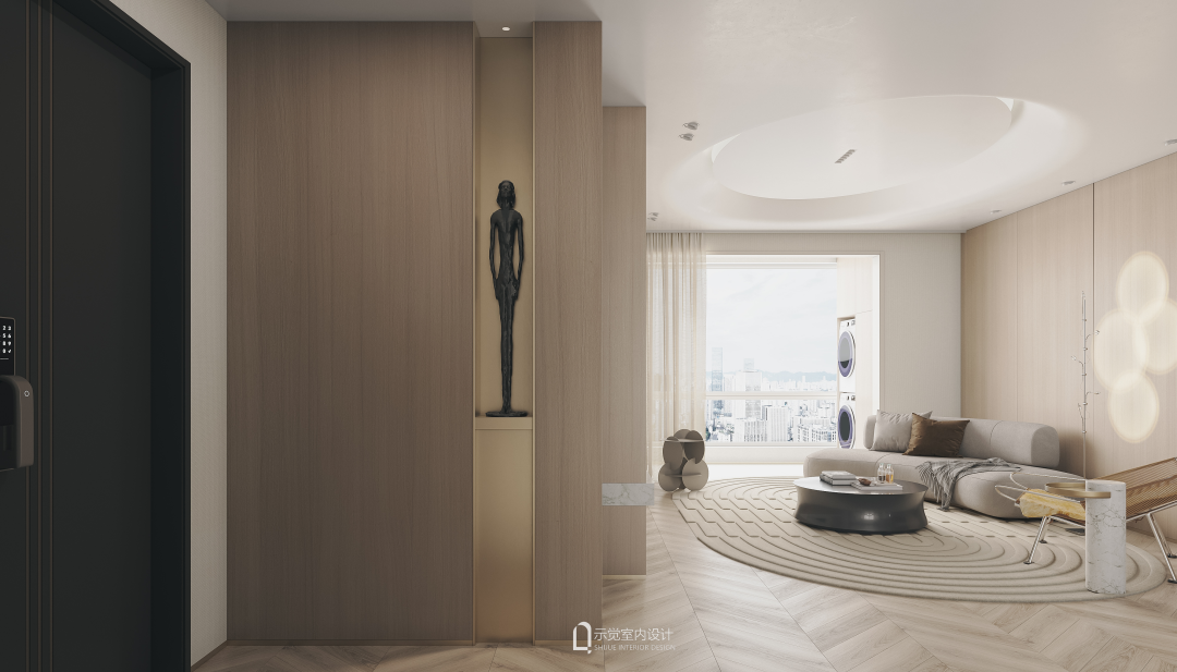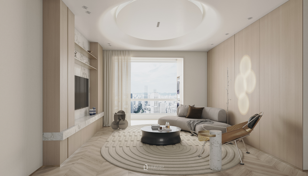 客厅打通阳台移门,面积得以向南延伸。椭圆地毯和椭圆吊顶造型相互辉映,墙面运用了大量浅色系木饰面元素,简单而有质感。客厅沙发采用围合式布局,互动感更强烈。
